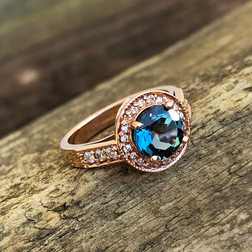 Ornate and divinely decadent, a vibrant round-cut London blue topaz sits at the heart of this ring surrounded by rich rose gold and embedded with diamonds. Shimmering white diamonds in the halo surrounding the topaz and embedded in the shoulders of the band contrast vividly with the warm hues of the rose gold.