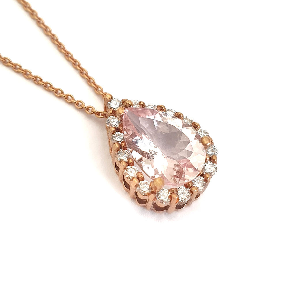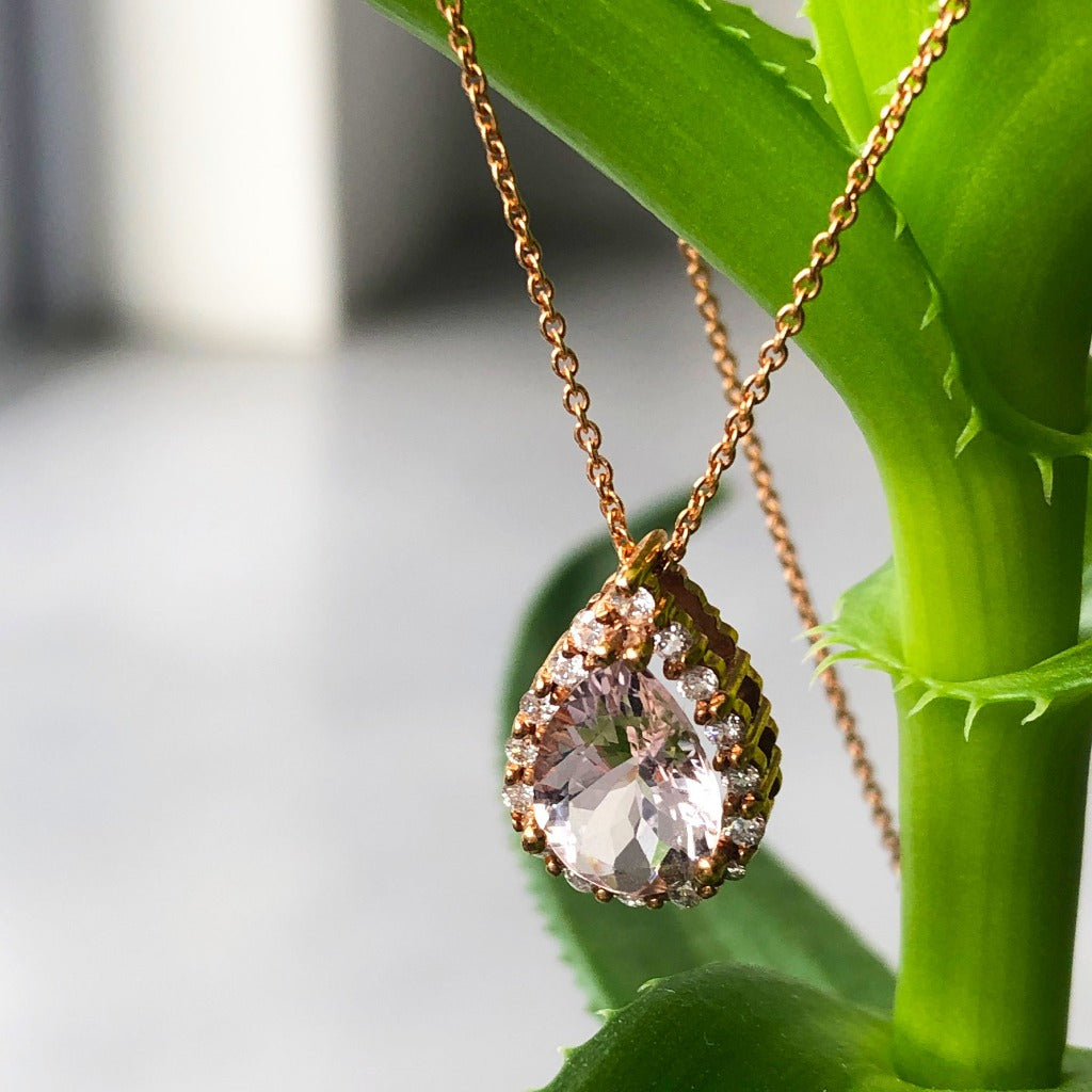 Rose Gold Pear Cut Pink Morganite and Diamond Halo Pendant