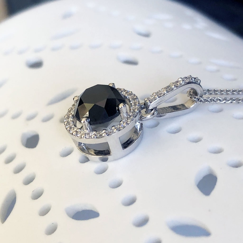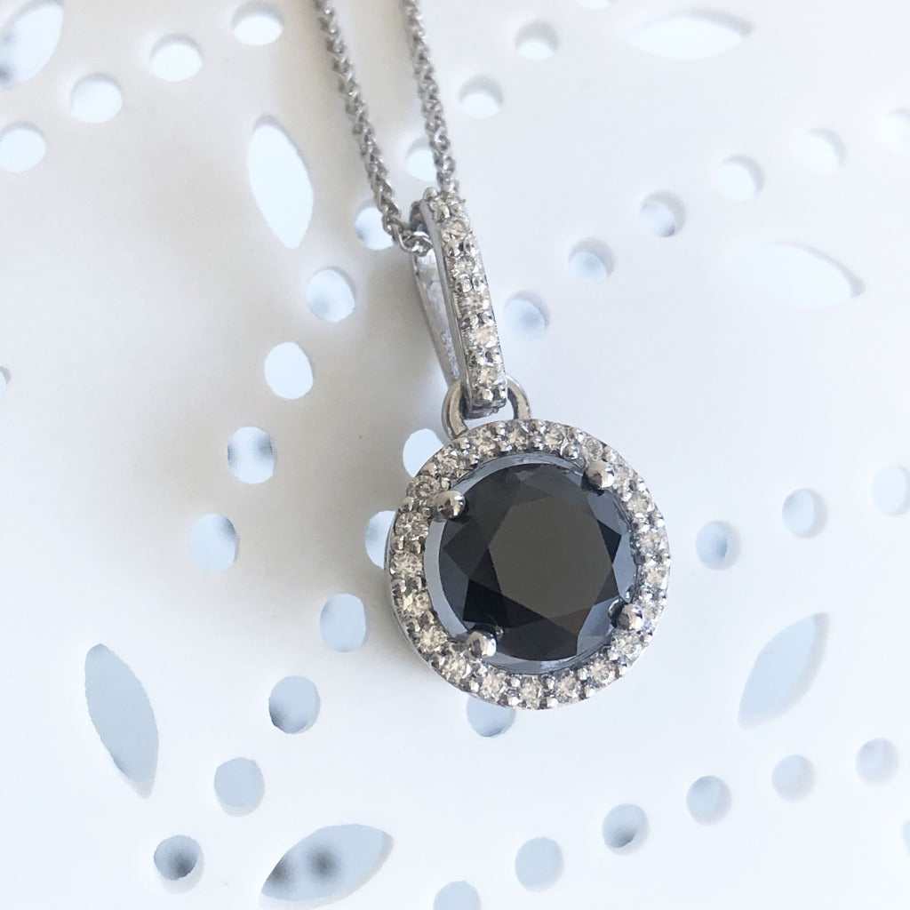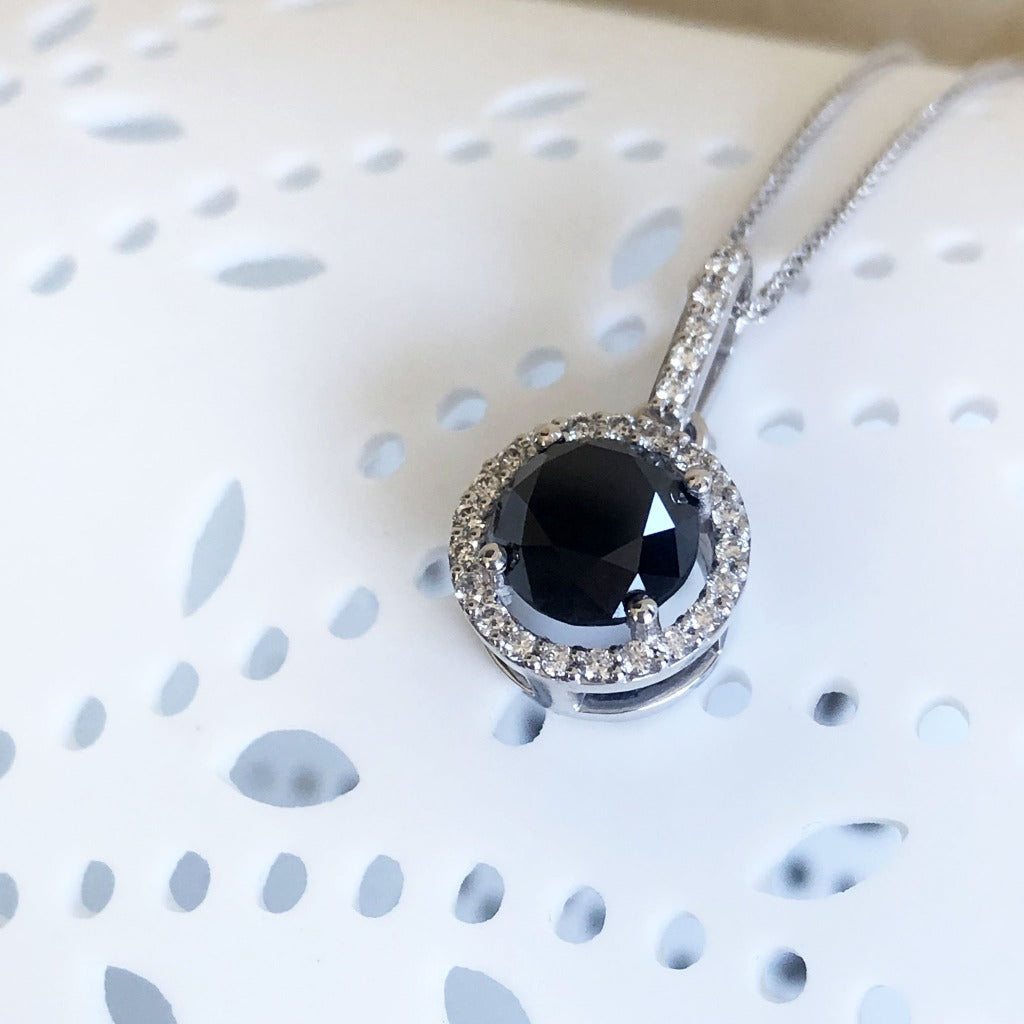 Round Cut Black Diamond Pendant with White Diamond Halo