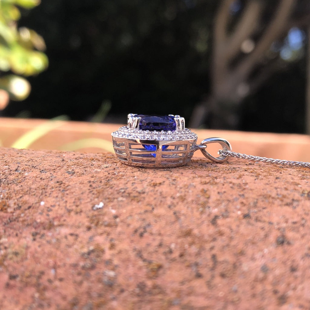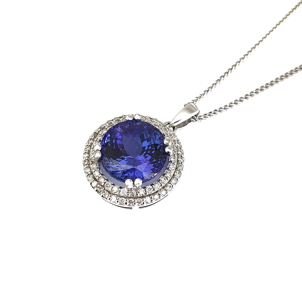 Scintillating Tanzanite and Double Diamond Halo Pendant