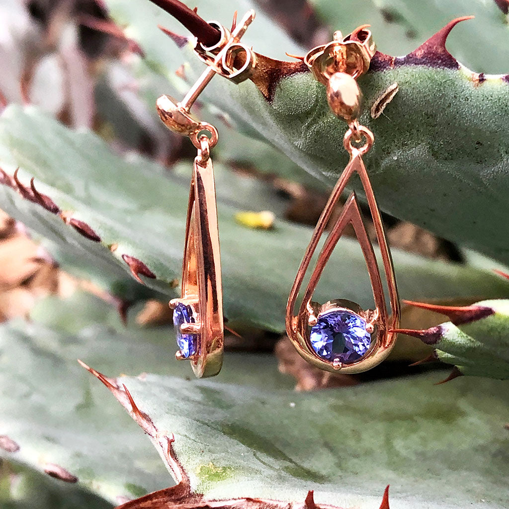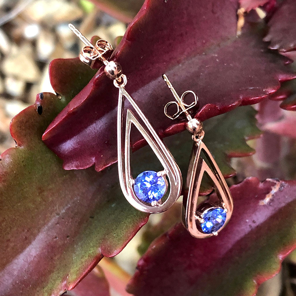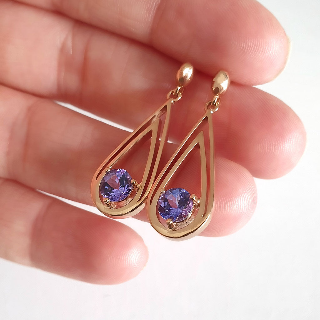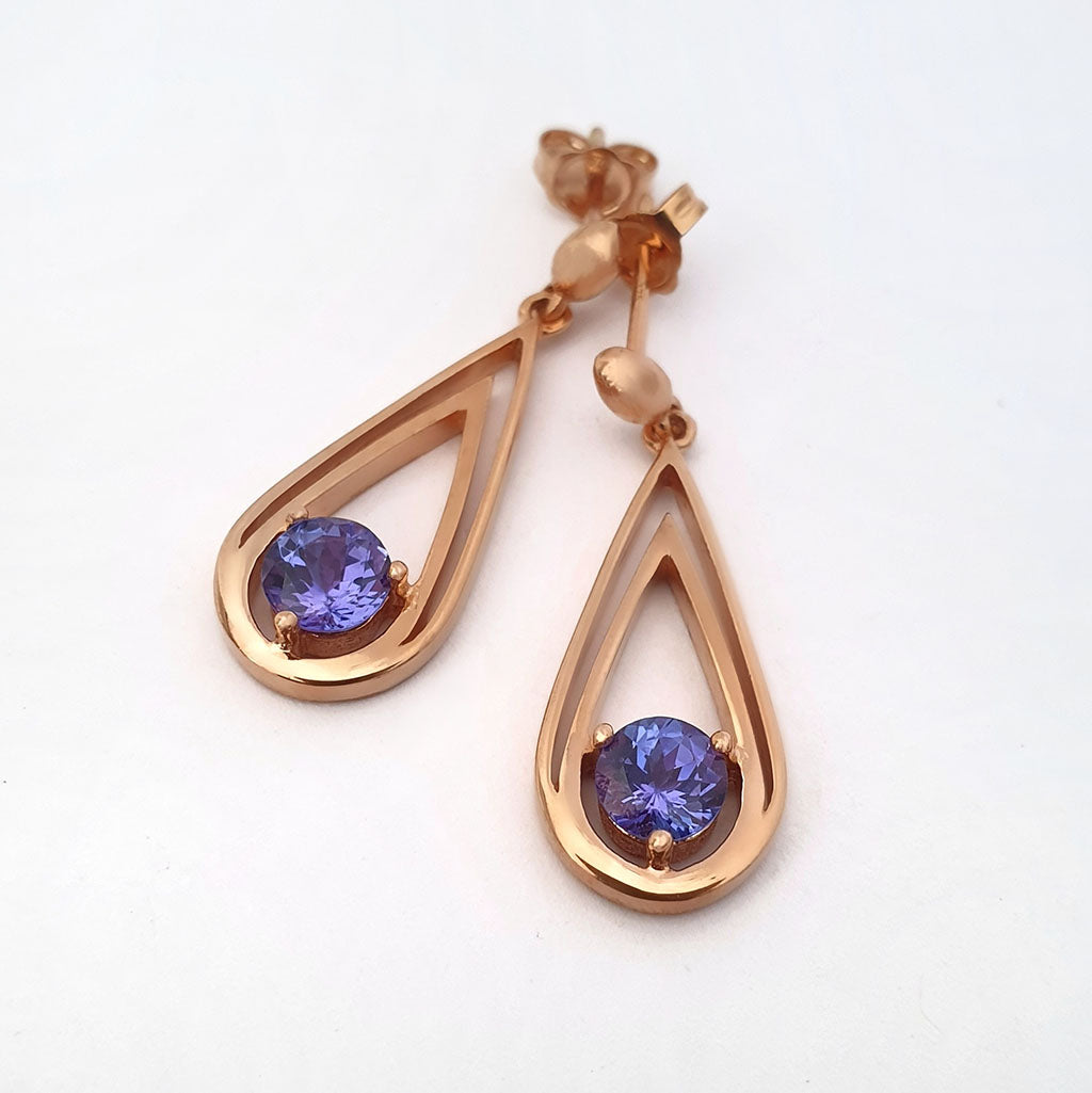 Double Droplet Round Cut Tanzanite Rose Gold Drop Earrings