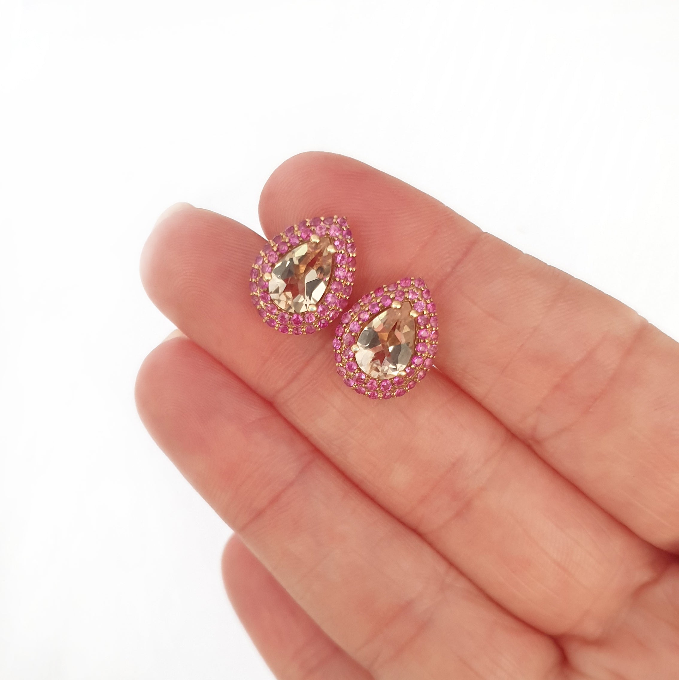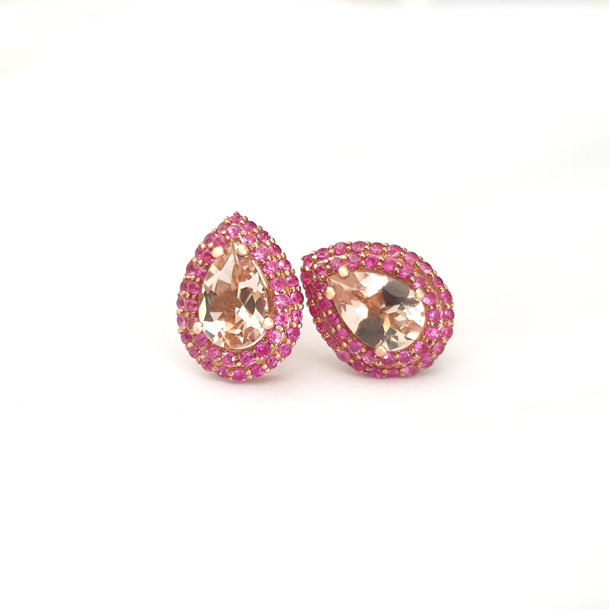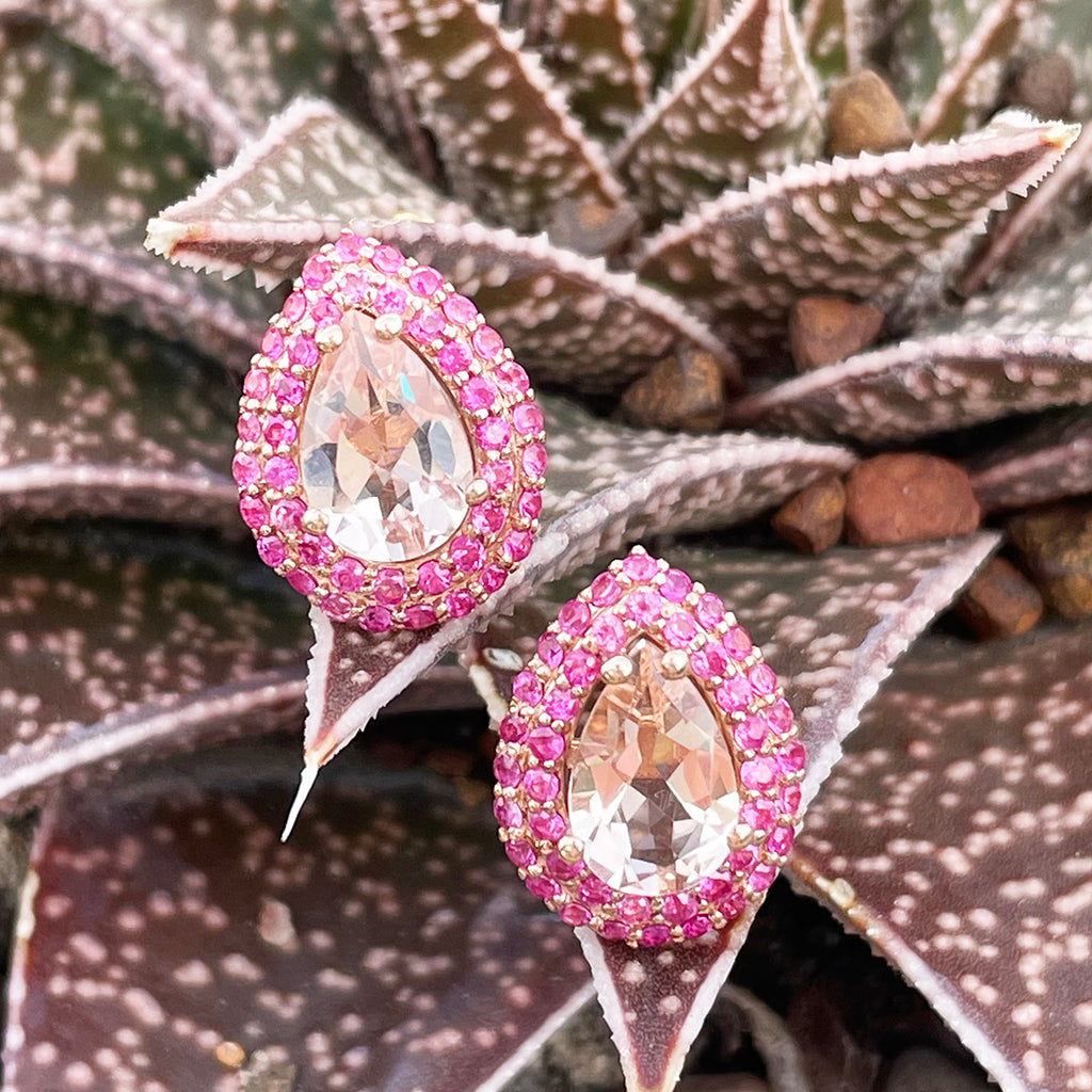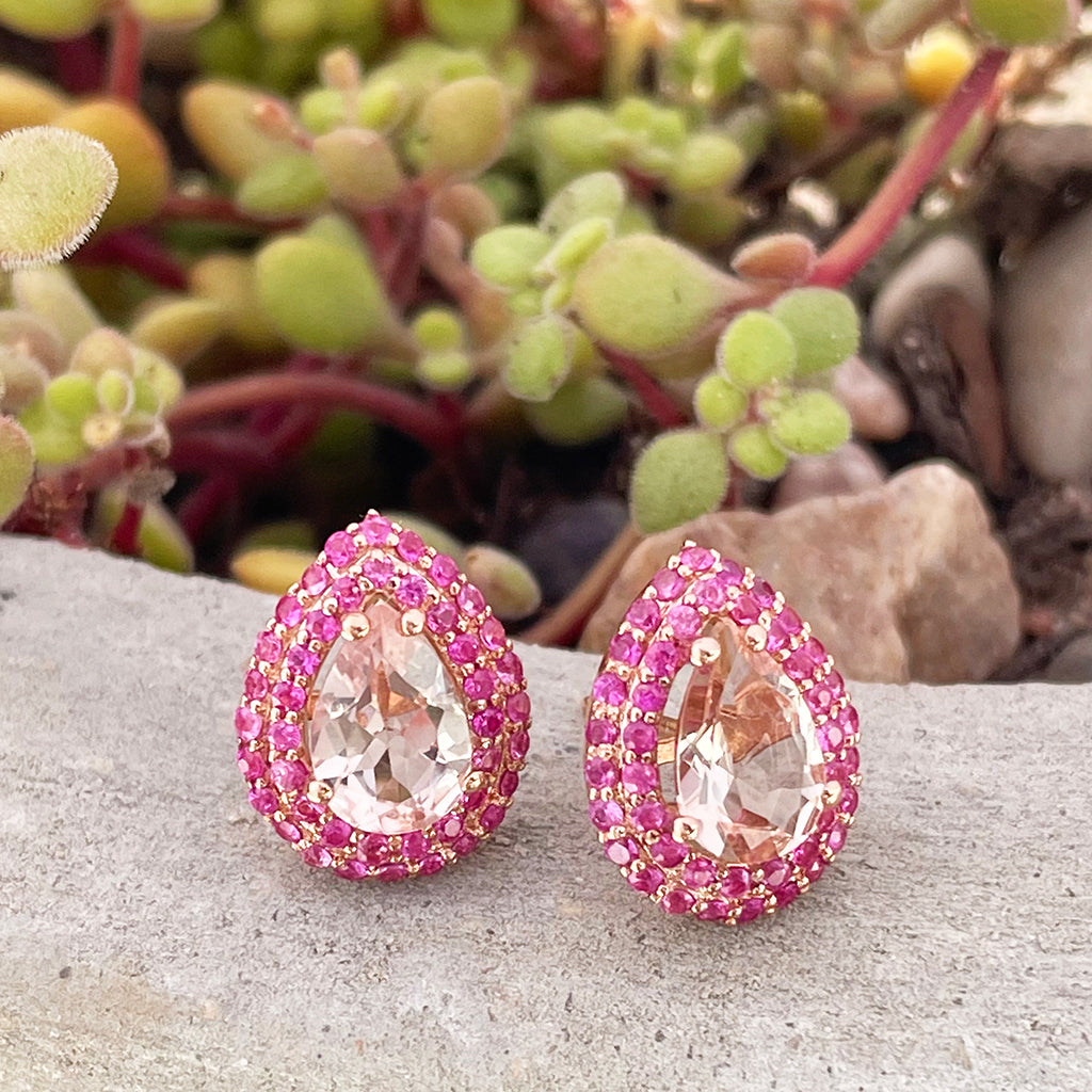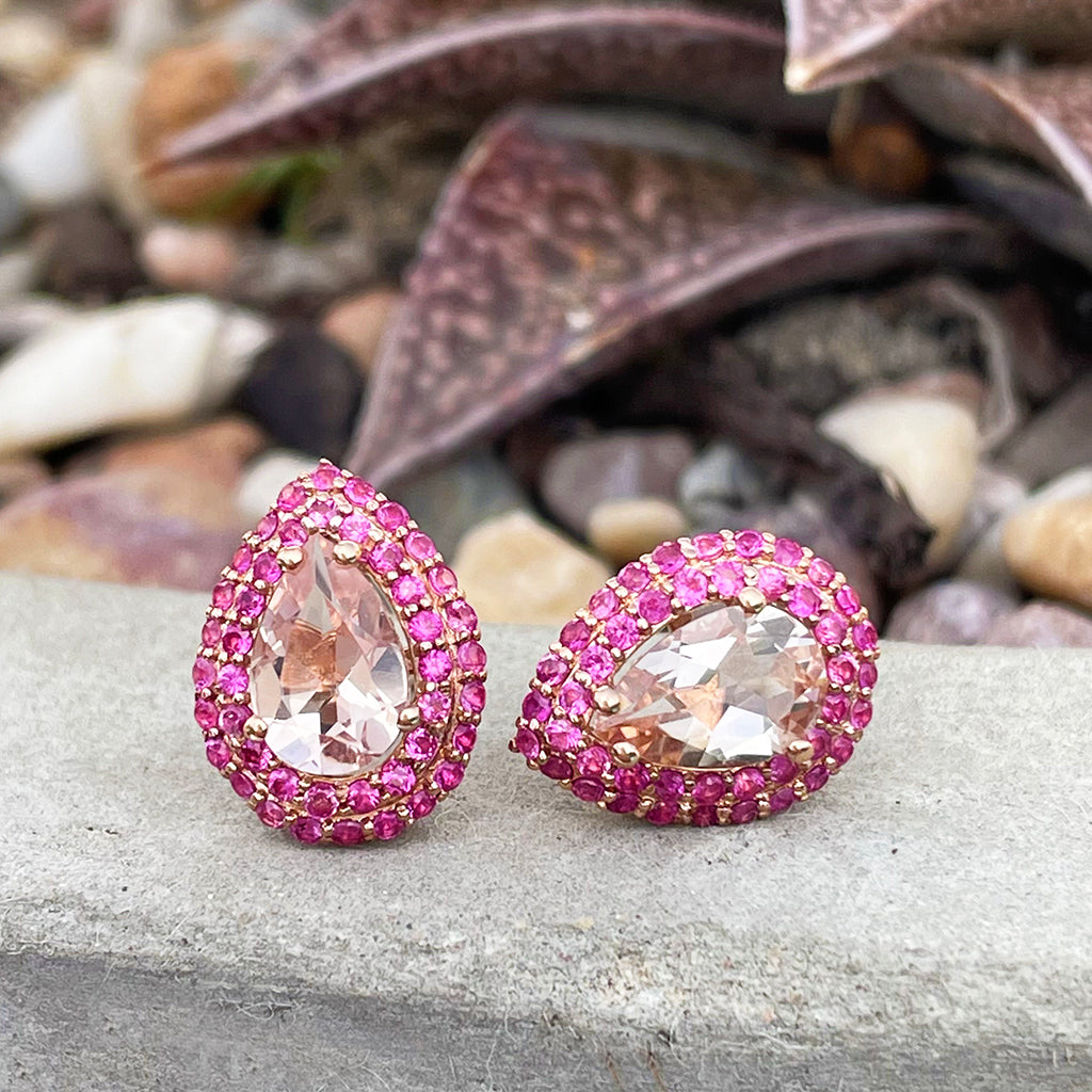 Show Stopping Morganite and Double Pink Sapphire Halo Stud Earrings