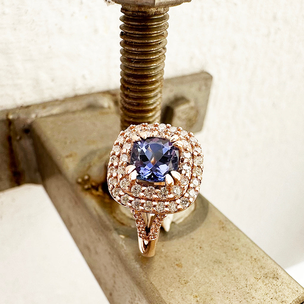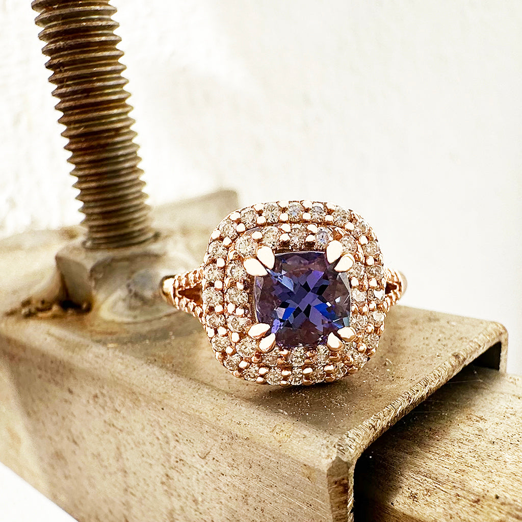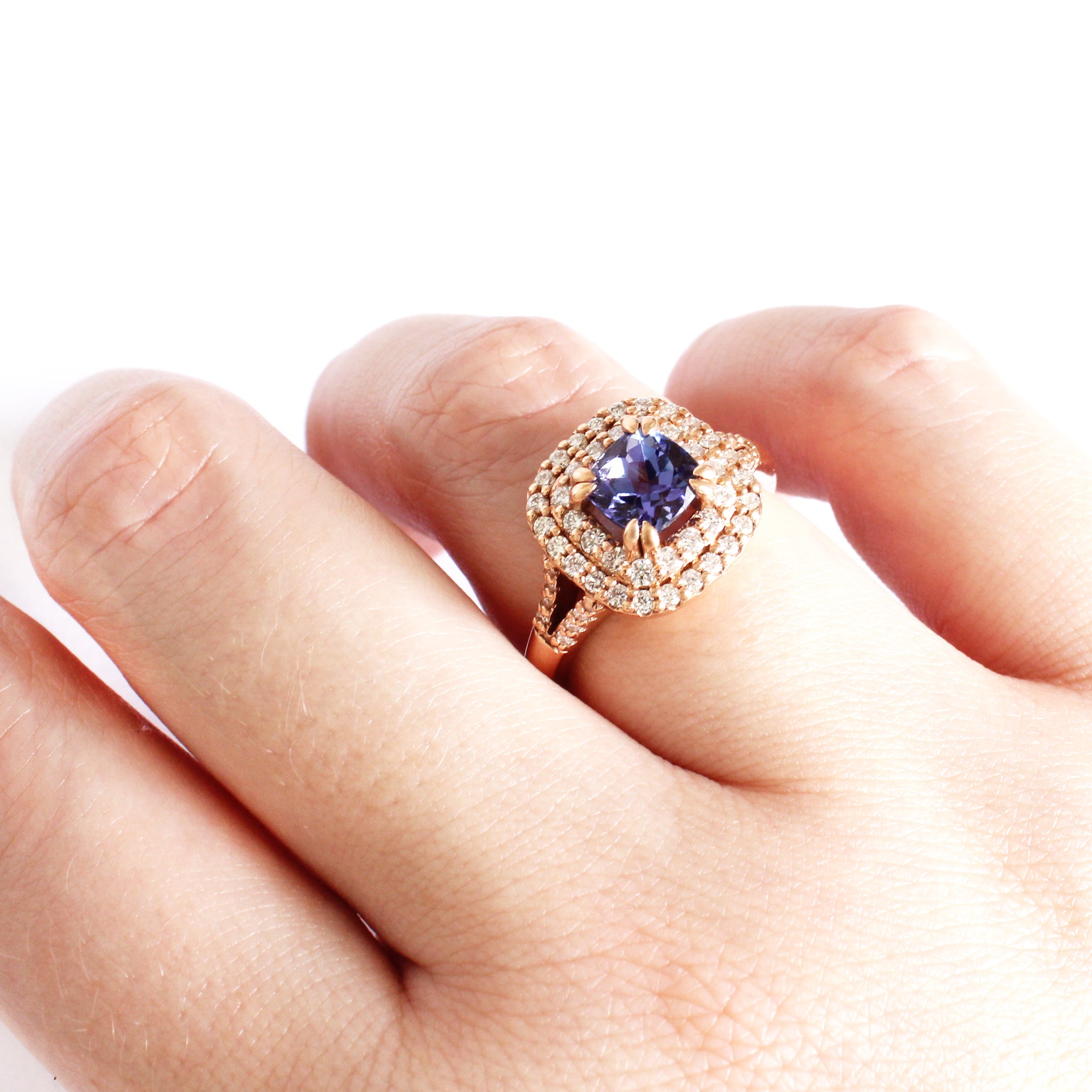 Show Stopping Square Diamond Halo Cushion Cut Tanzanite Rose Gold Ring
