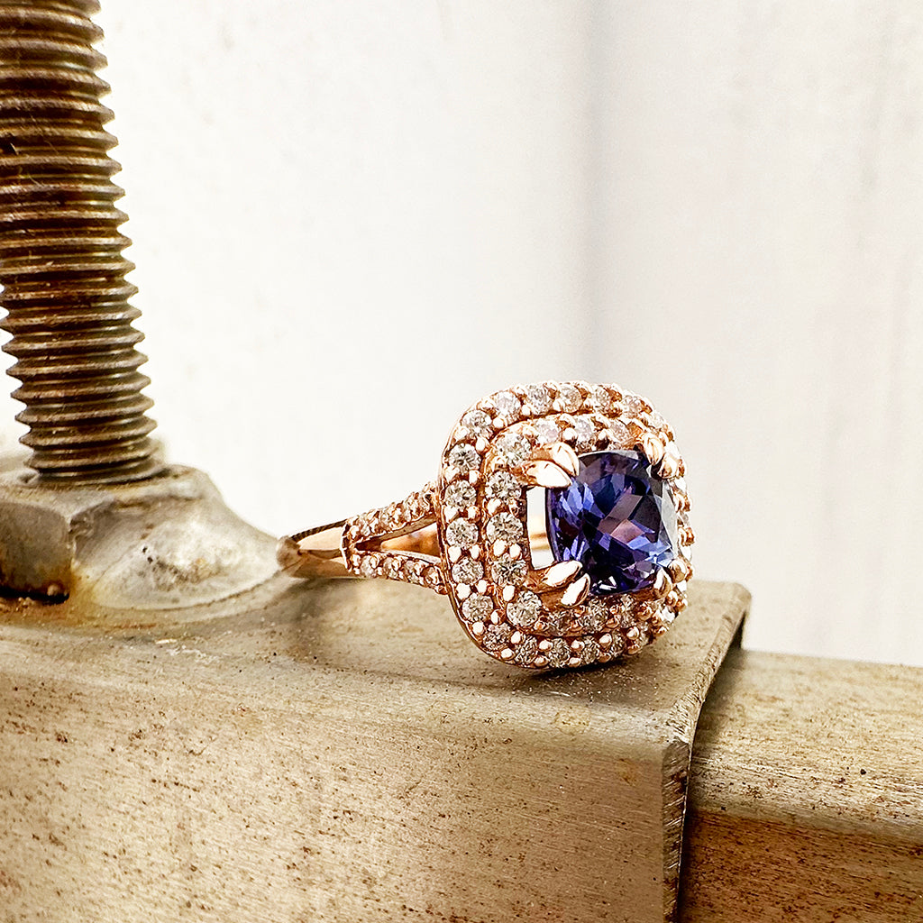 This ring is a harmonious symphony of passionate rose gold, the richness of cushion-cut tanzanite, and the glittering fire of diamonds, creating a piece that radiates sophistication and extravagance.