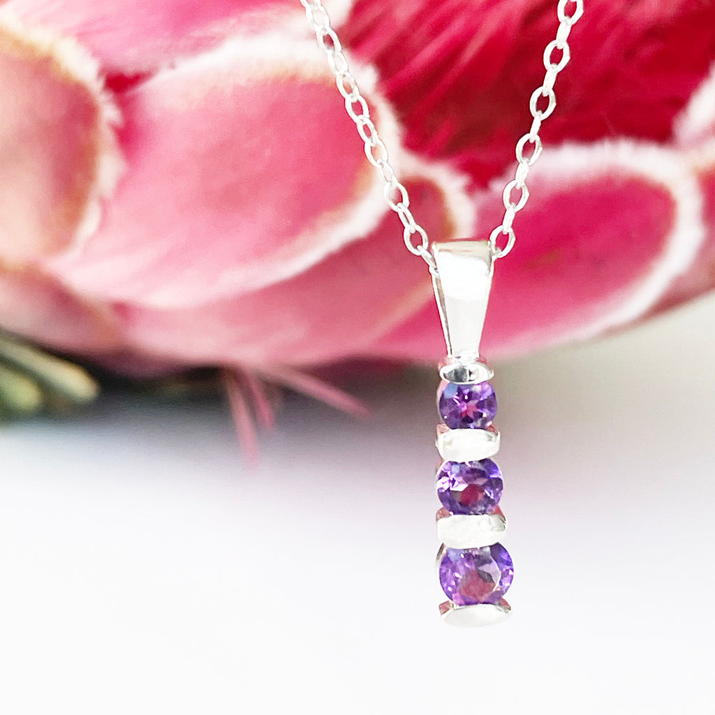 A trilogy of gemstones symbolises friendship, love and fidelity, the relationship trifecta. This silver three-bar pendant, set with three faceted round amethysts, creates a  provocative combination of passionate colour and flirty sparkle. It's the perfect pendant to tell her you'll never tire of her charming smile and witty repertoire without having to utter a word.