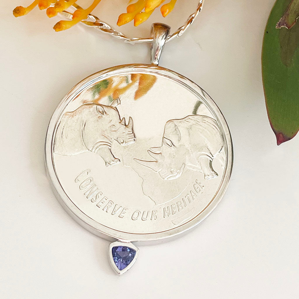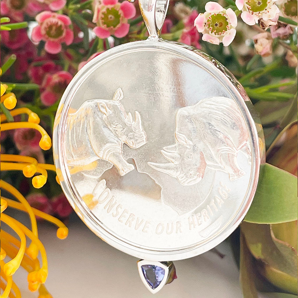 Silver Double Rhino Africa Coin With Trilliant Tanzanite Detail Pendant
