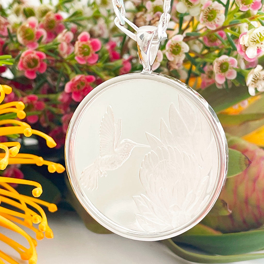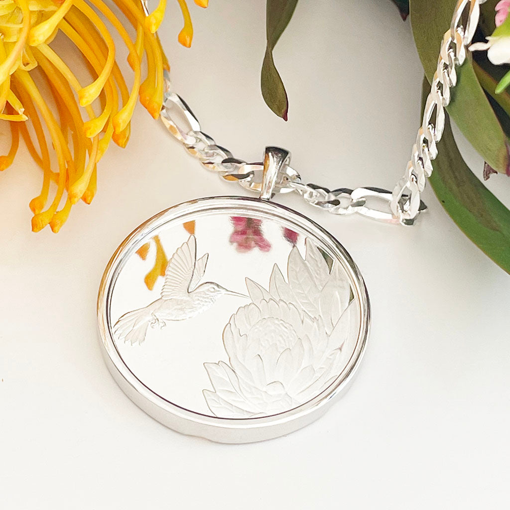 Silver Hummingbird Bird and Protea Silver Coin Pendant