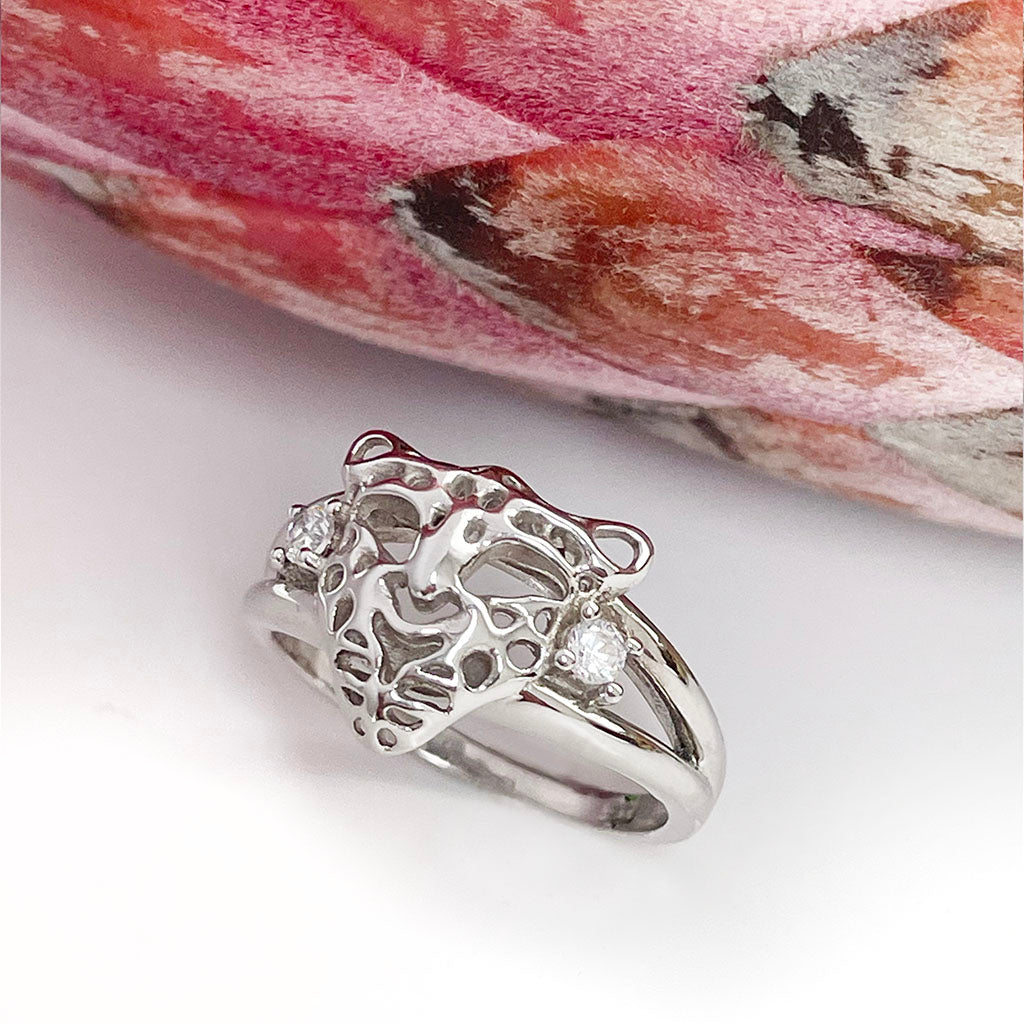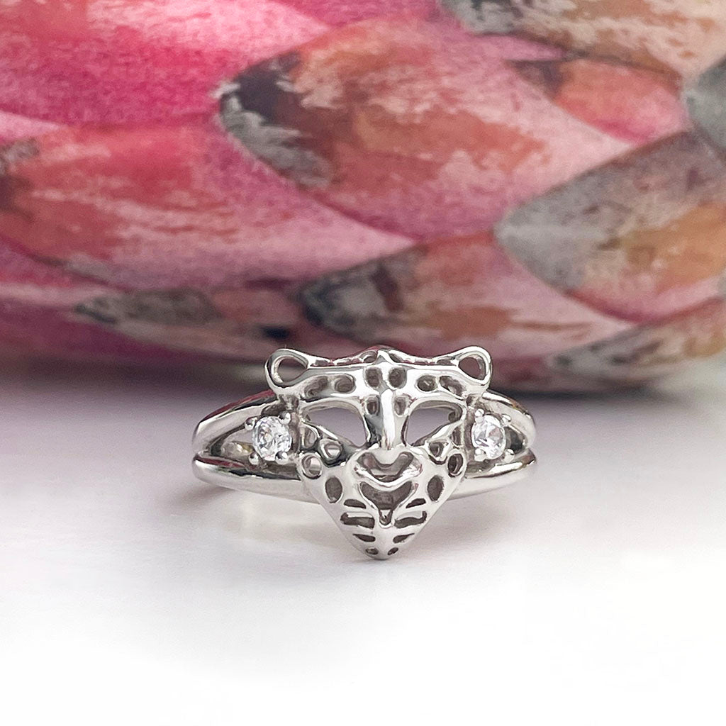 Silver Leopard Head Ring with Cubic Zirconia Accents