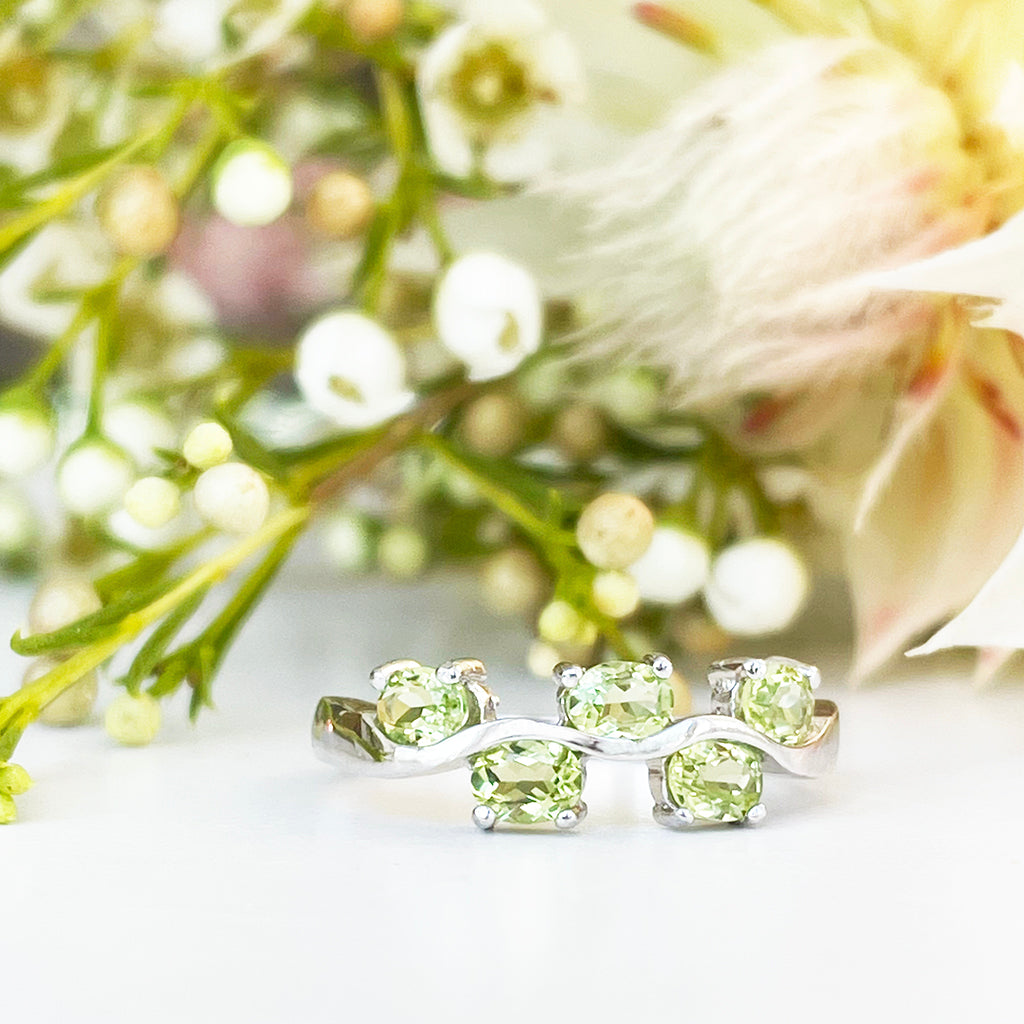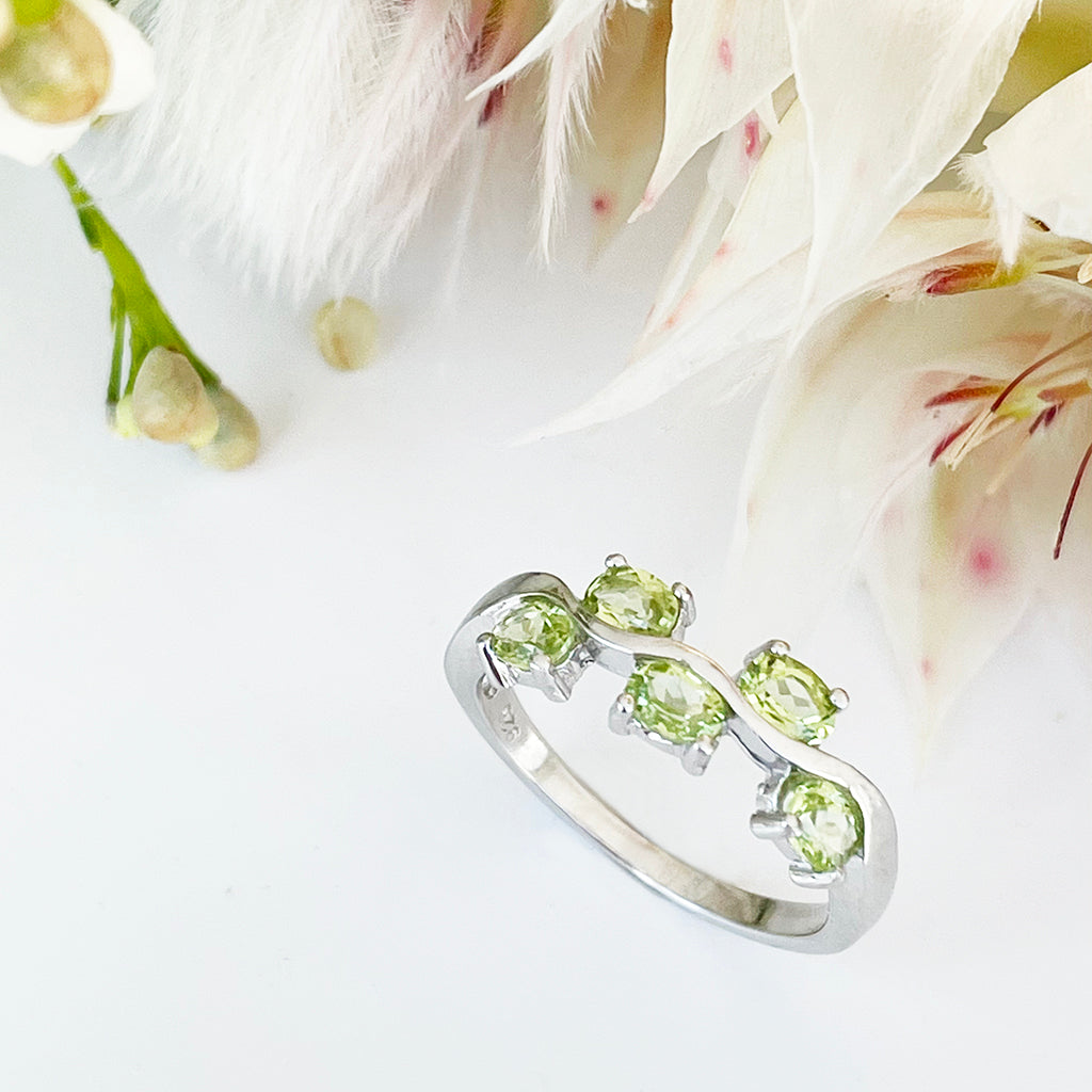 The number five symbolises freedom, curiosity, and change, making this dynamic wave ring crafted in silver and set with five faceted oval peridot the perfect choice for creative souls. The design is contemporary and elegant, with a large dose of quirky fun.
