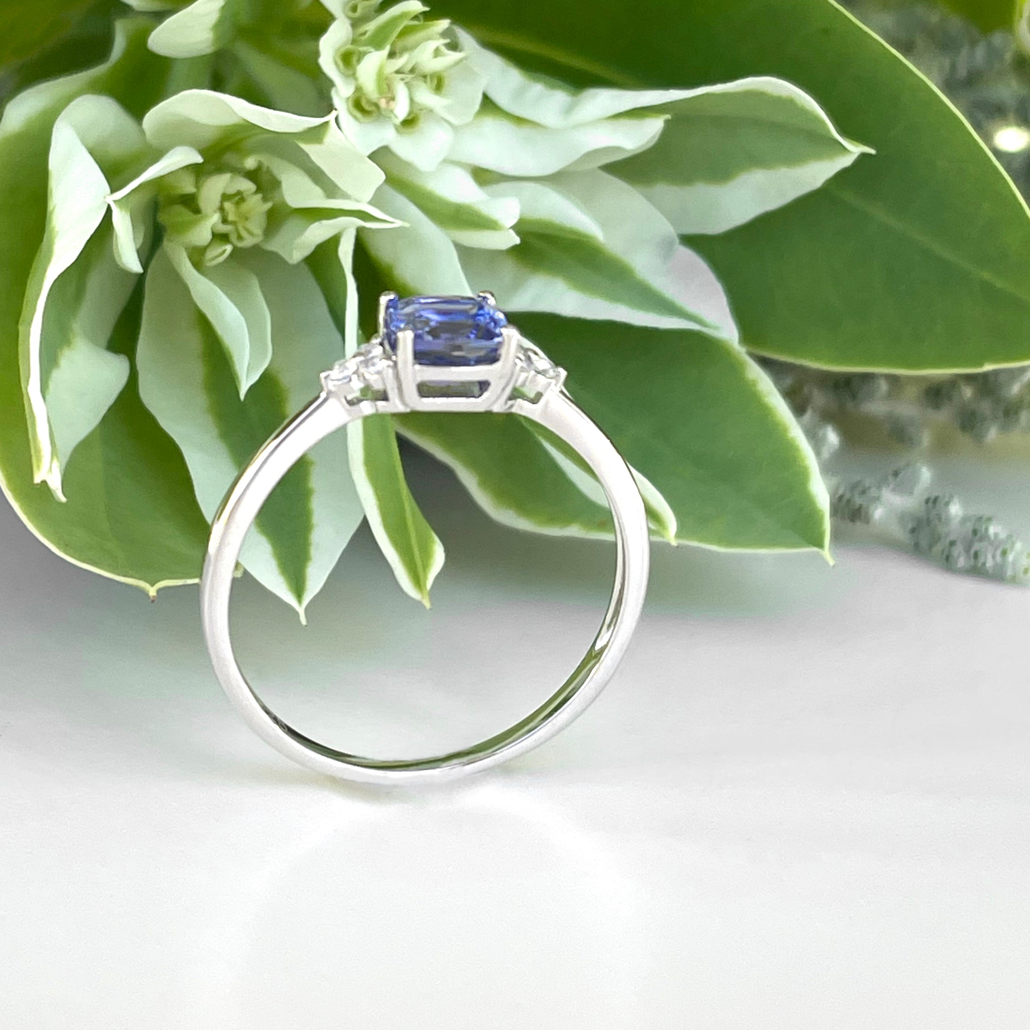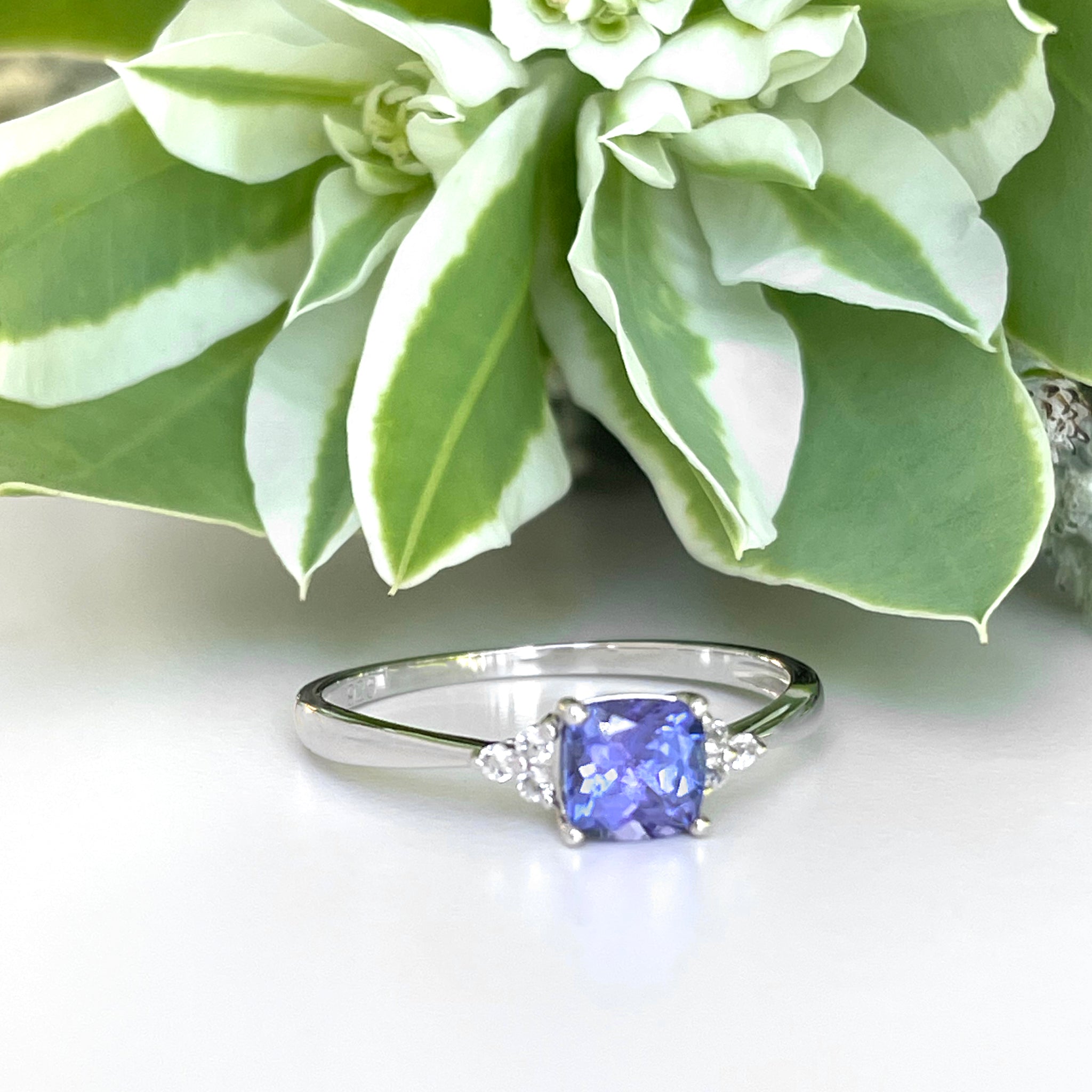 Silver Petite Cushion Cut Tanzanite with Trilogy Silver Topaz Highlight Ring