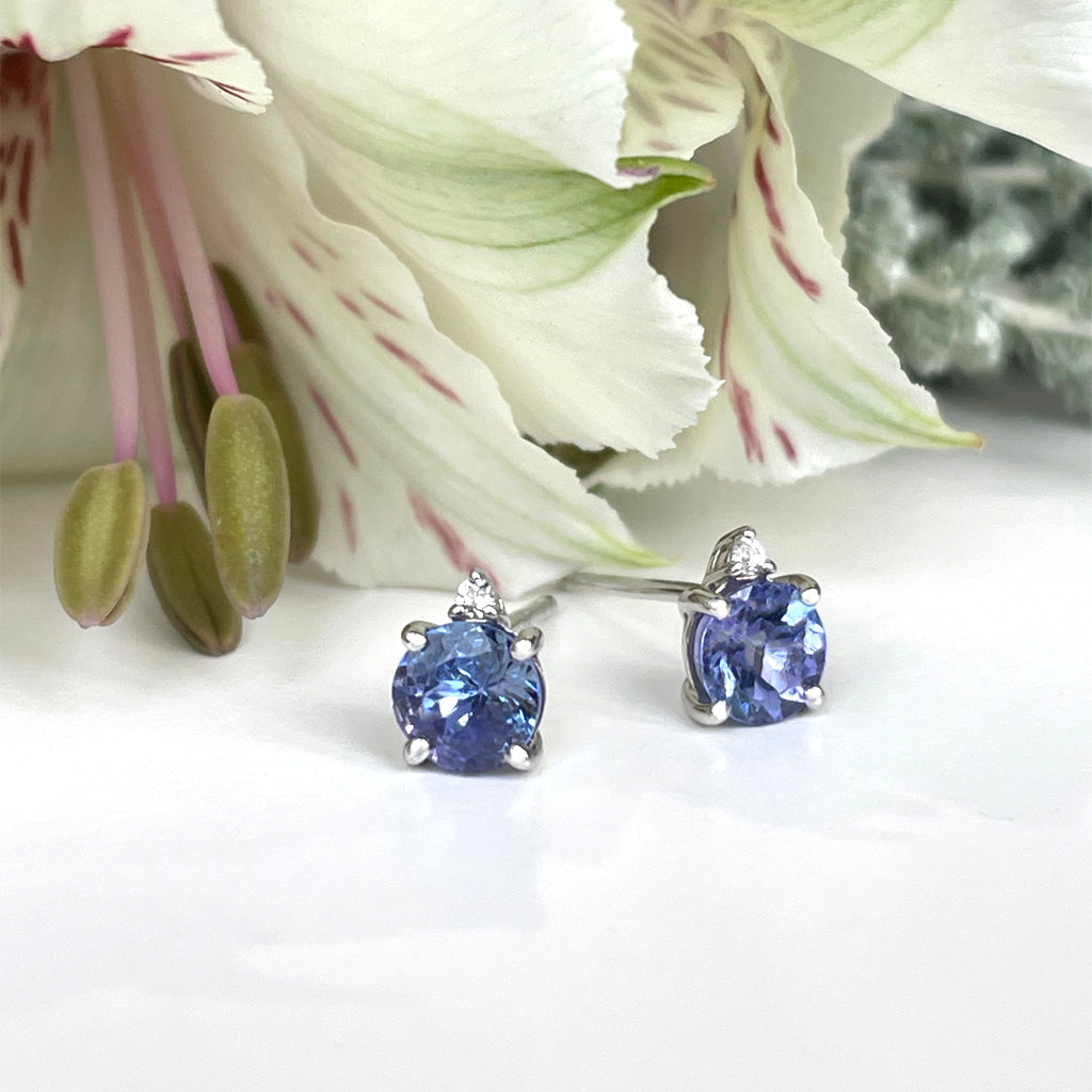 Silver Petite Round Cut Tanzanite with Single Silver Topaz Highlight Earrings