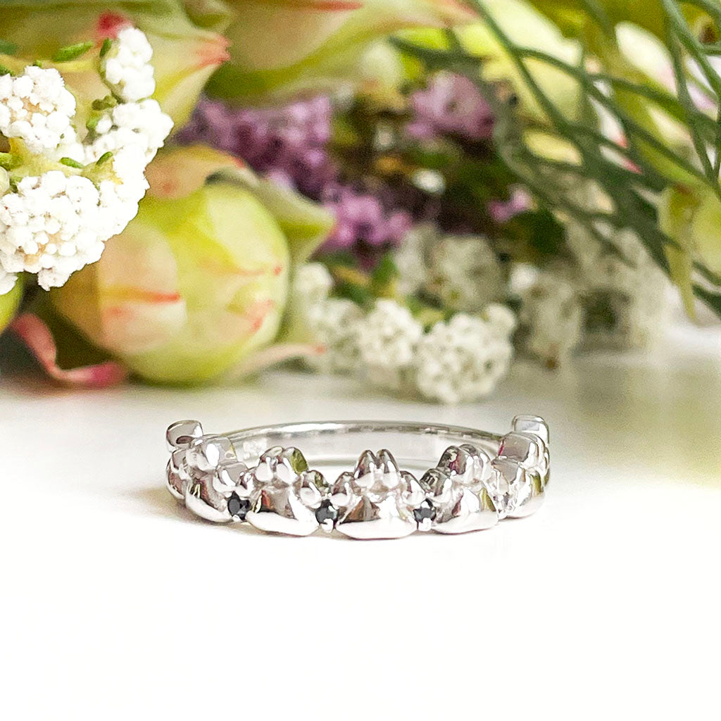 This unique ring celebrates wild Africa with an exquisite silver paw print design.  The ring is cast in silver and embedded with gorgeous black diamonds.