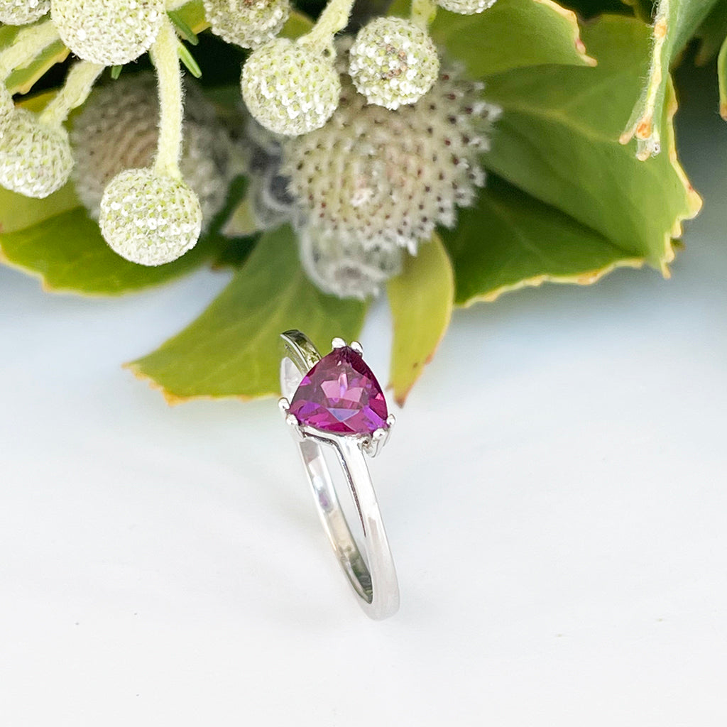 Silver Solitaire Rhodolite Trilliant Cut Ring