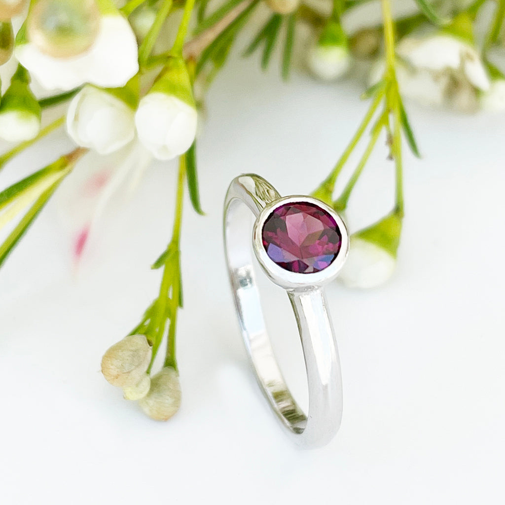 Silver Solitaire Round Tube Set Rhodolite Ring