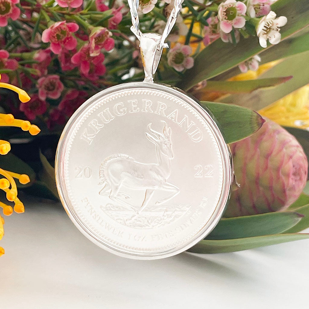 Silver Springbok Kruger Rand With Silver Border Pendant
