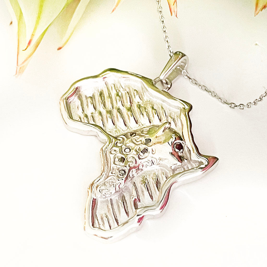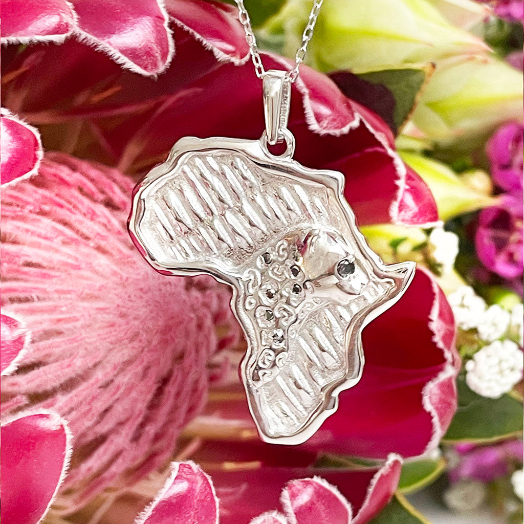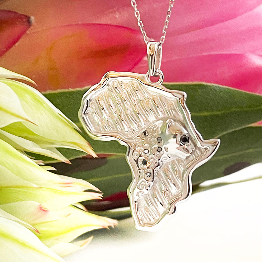 Silver Stand Out Leopard and Black Diamond Solid Africa Map Pendant