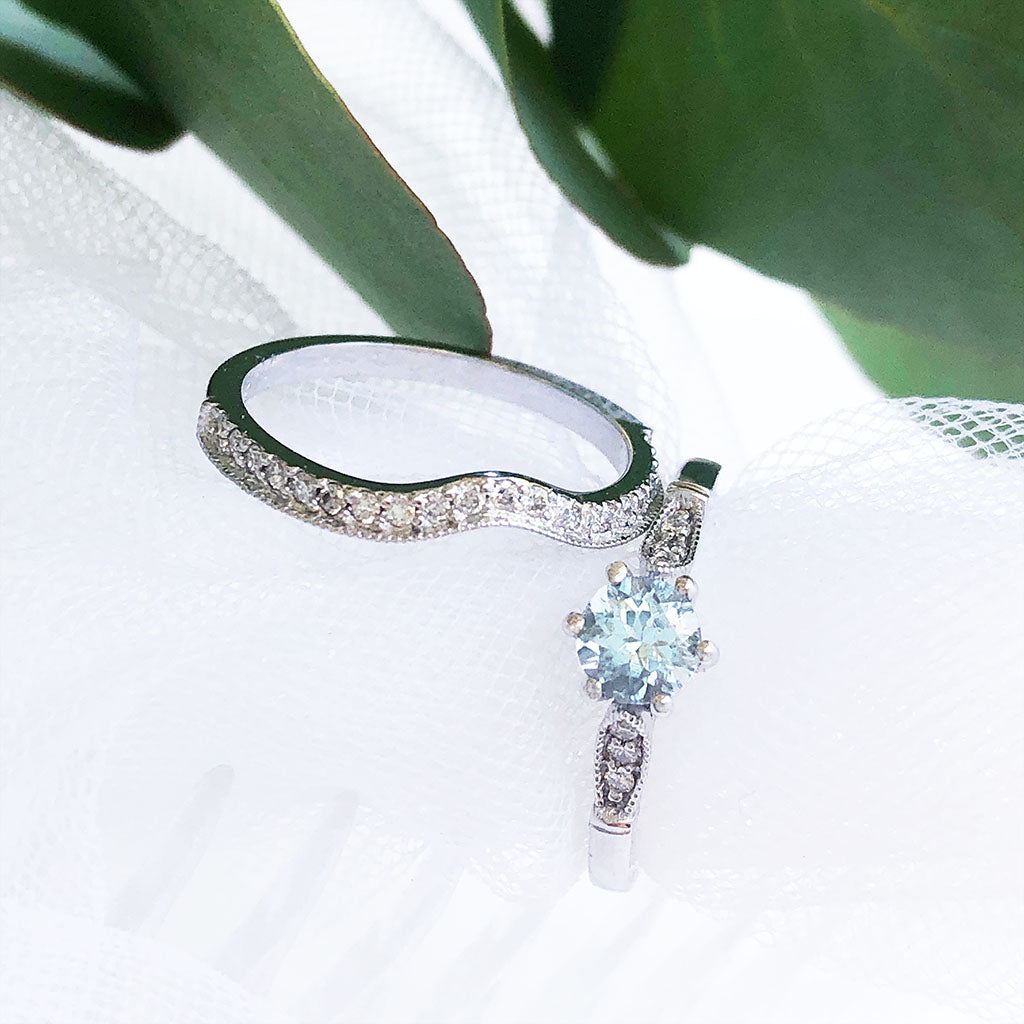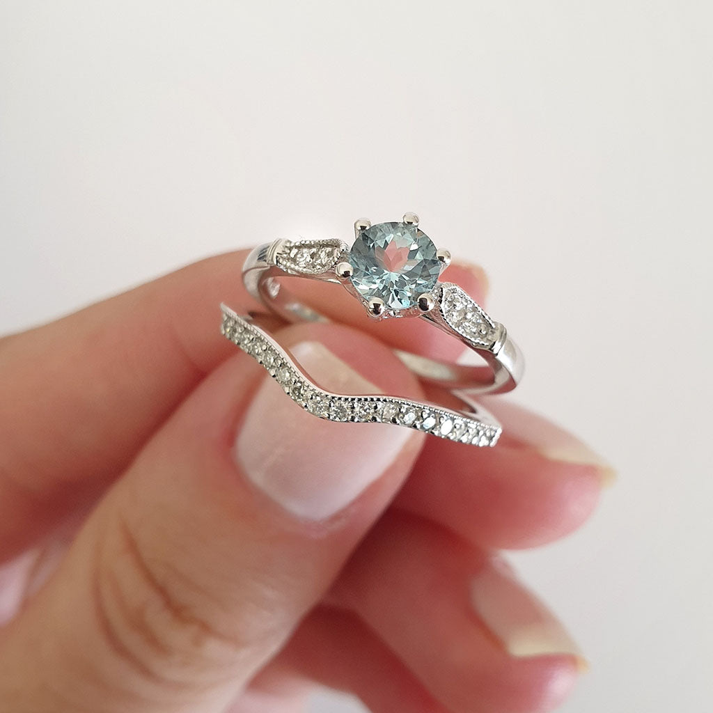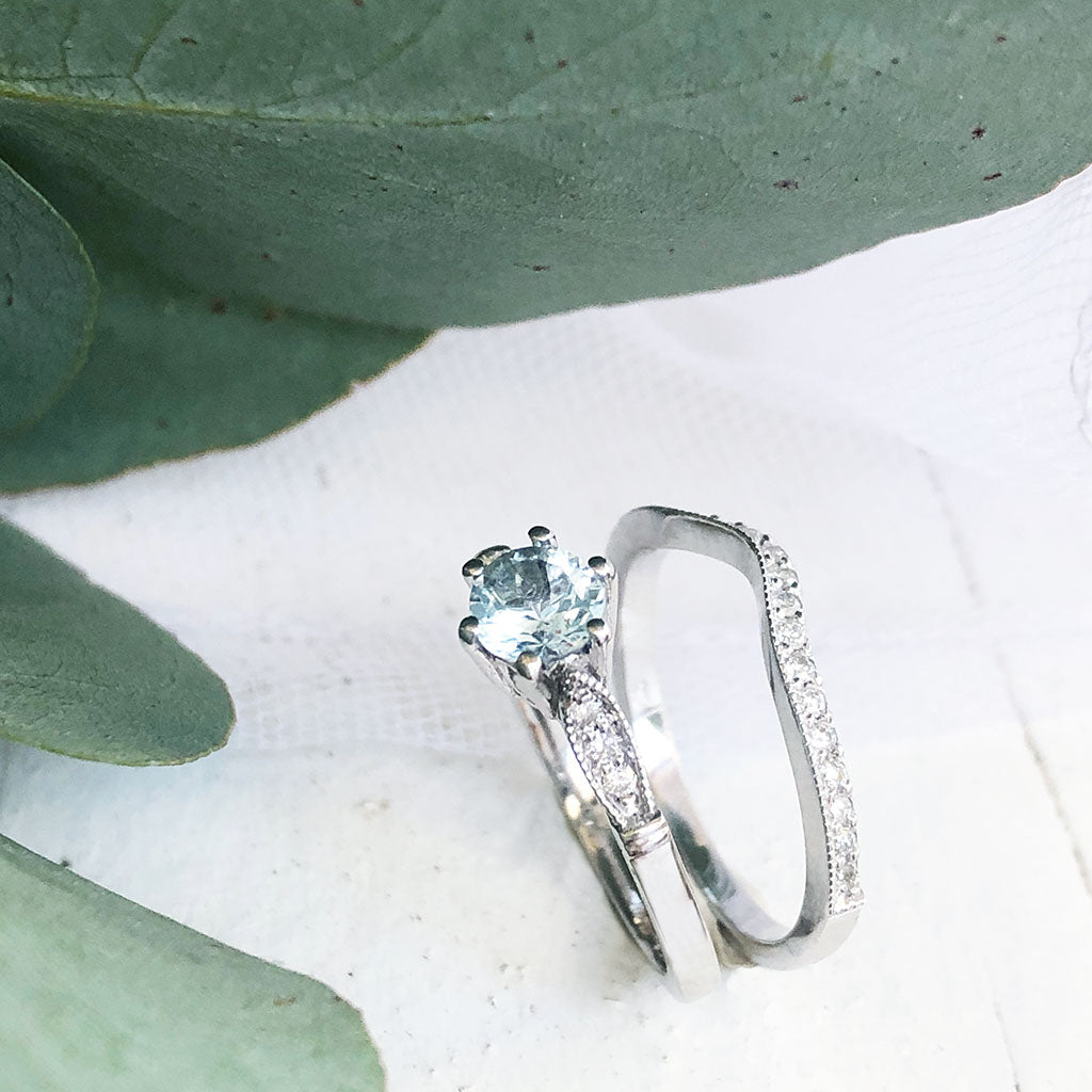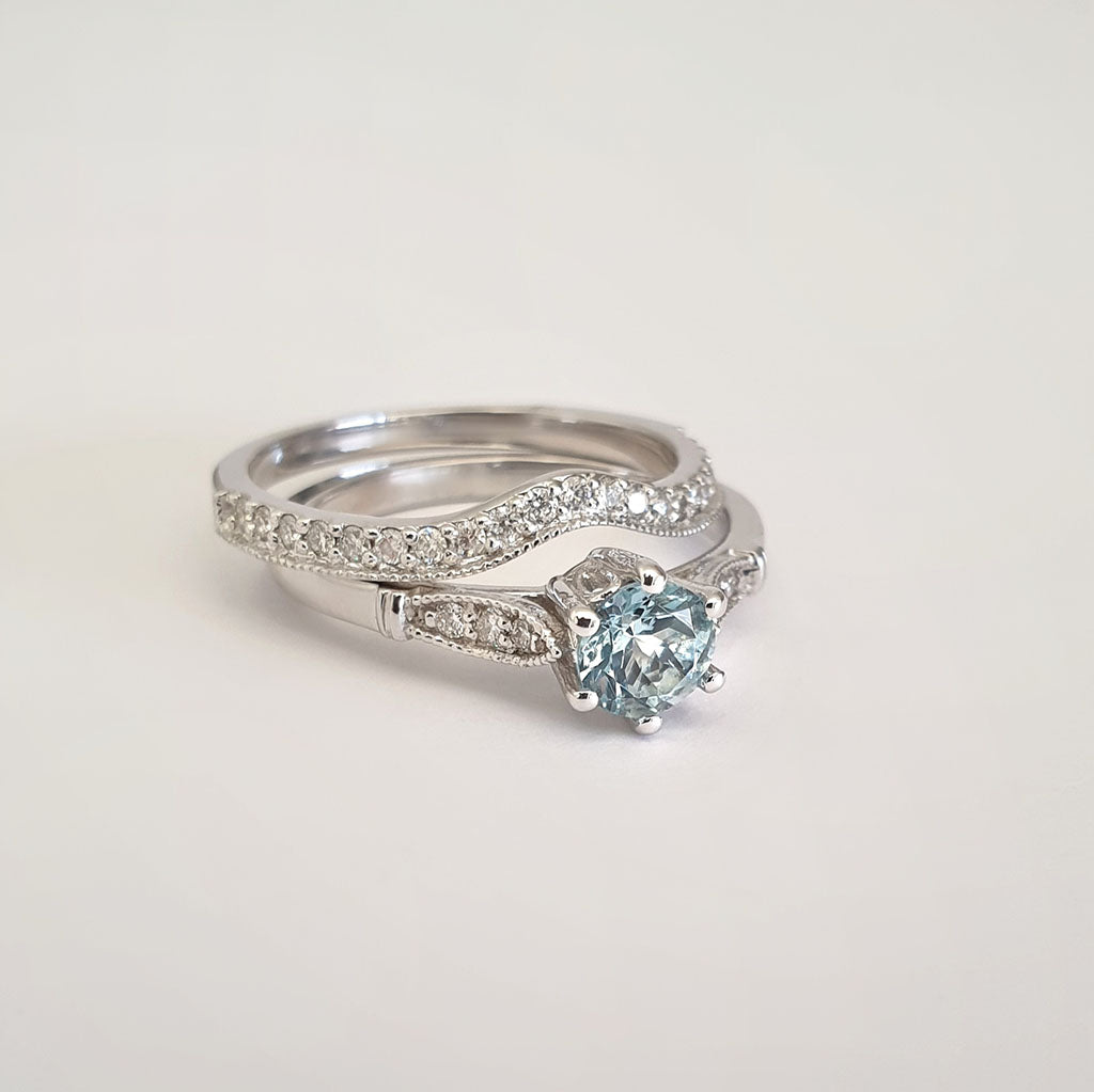 Six Claw Aquamarine Engagement Ring with Diamond Wedding Band Set