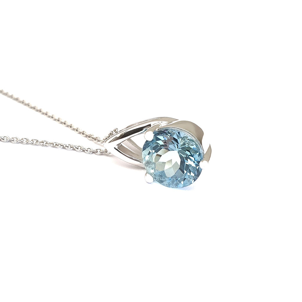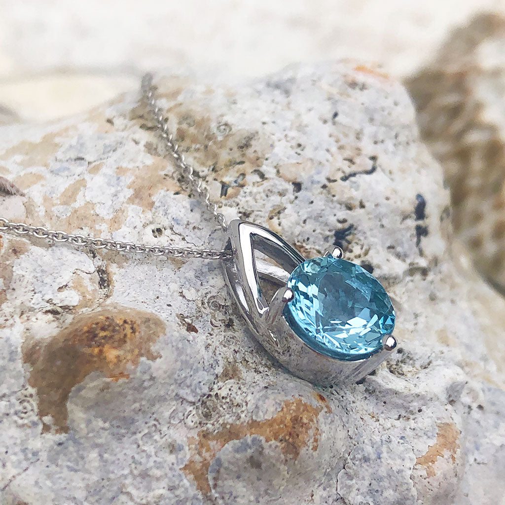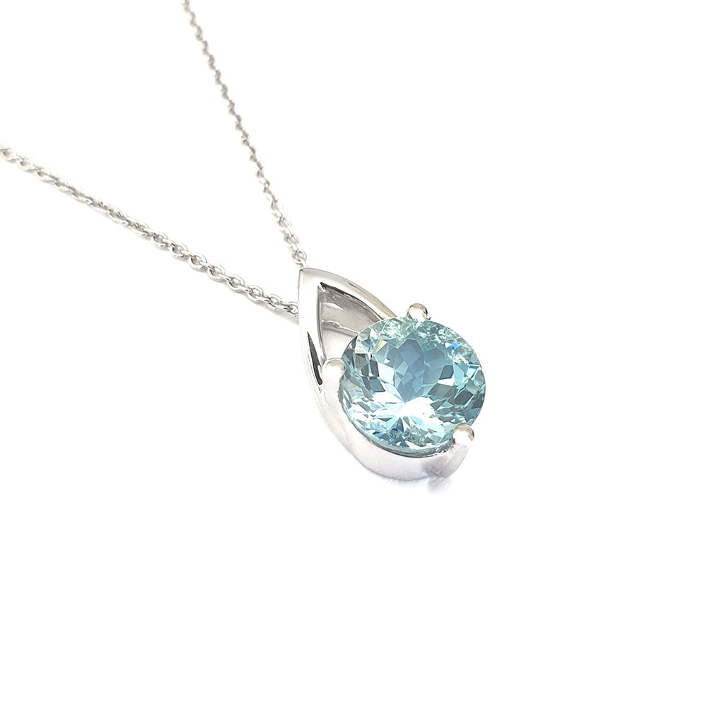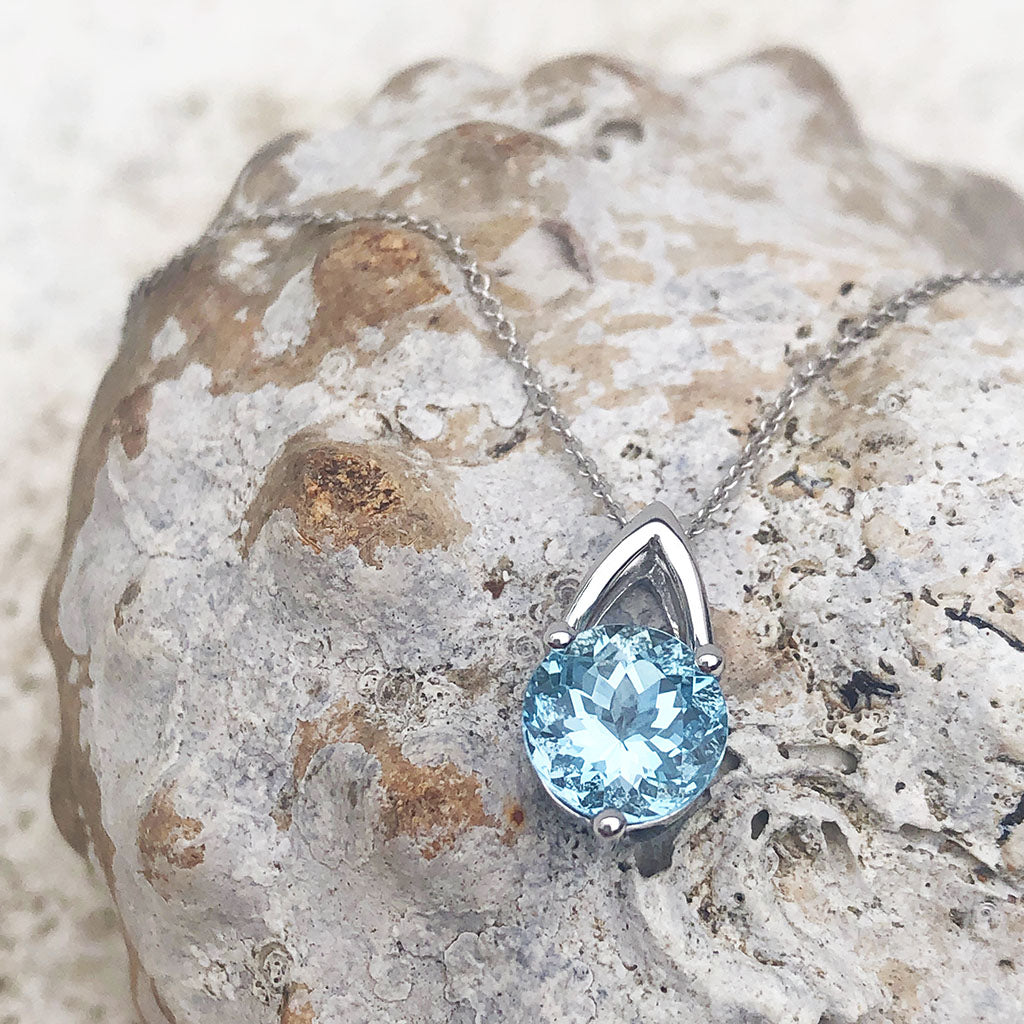 The striking singularity of this exquisite aquamarine and white gold pendant is highlighted an open V-shaped bale that drives attention to the round-cut light blue solitaire jewel, which in turn, draws the eye to your entrancing neckline with its sparkling clarity.