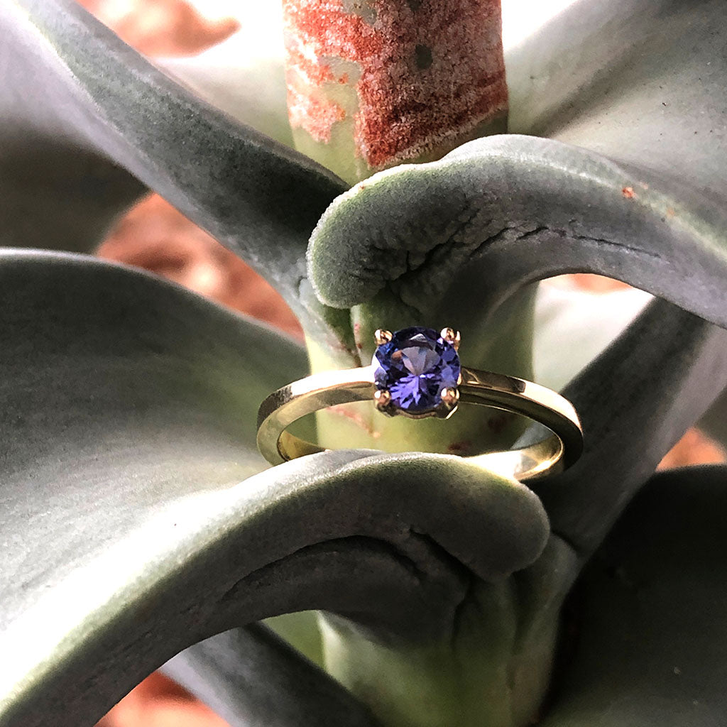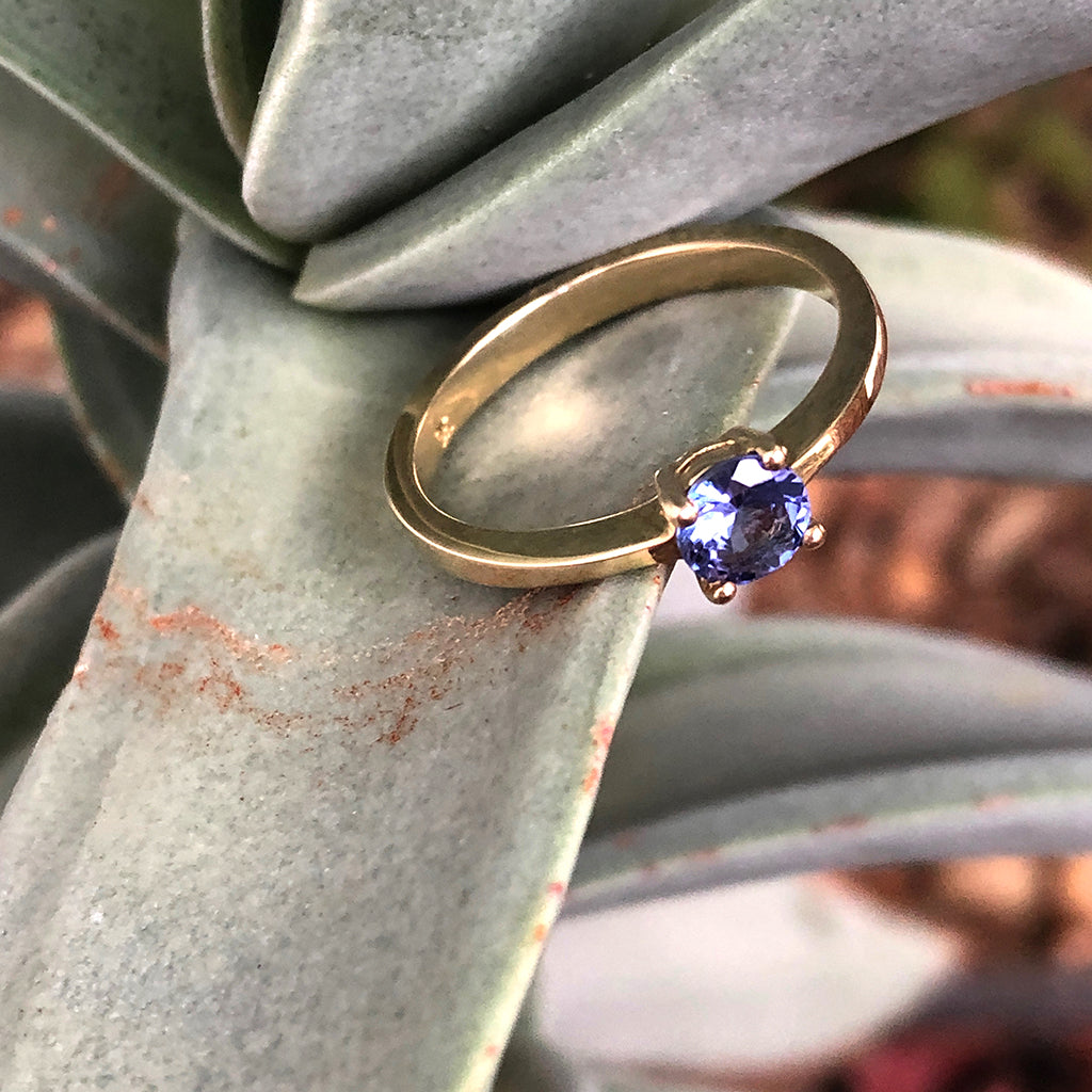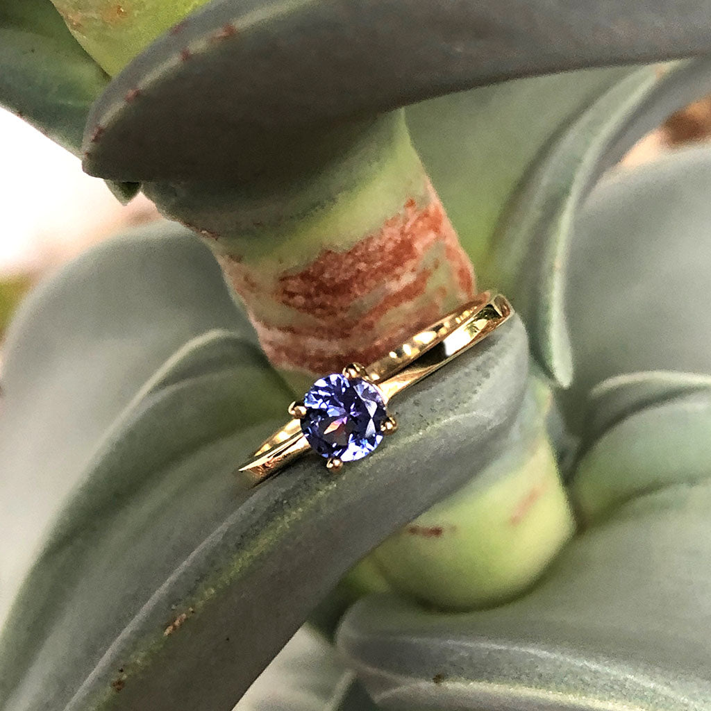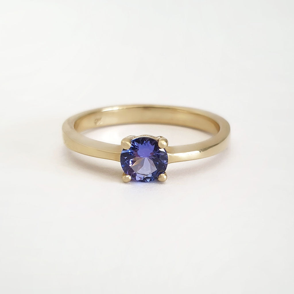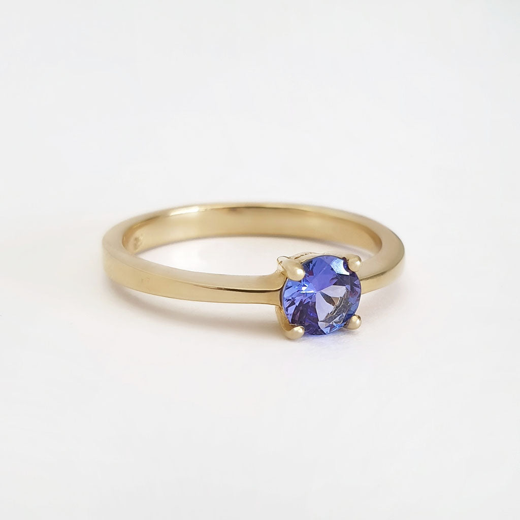 Solitaire Four Claw Round Cut Tanzanite Yellow Gold band Ring