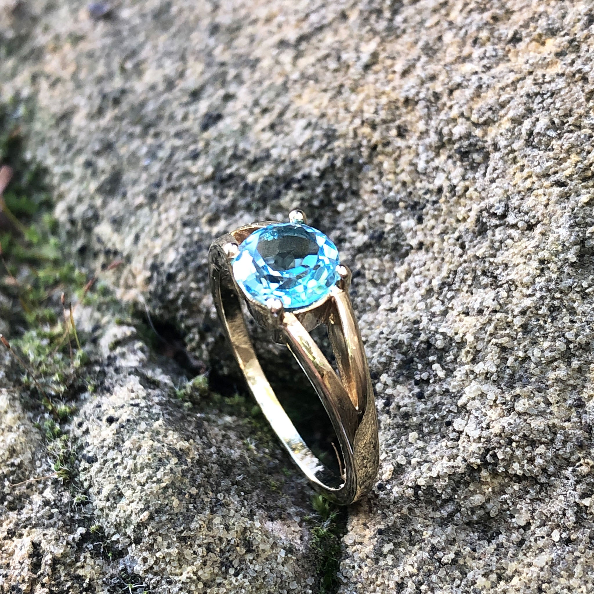Solitaitre Round Cut and Claw Blue Topaz Yellow Gold Ring