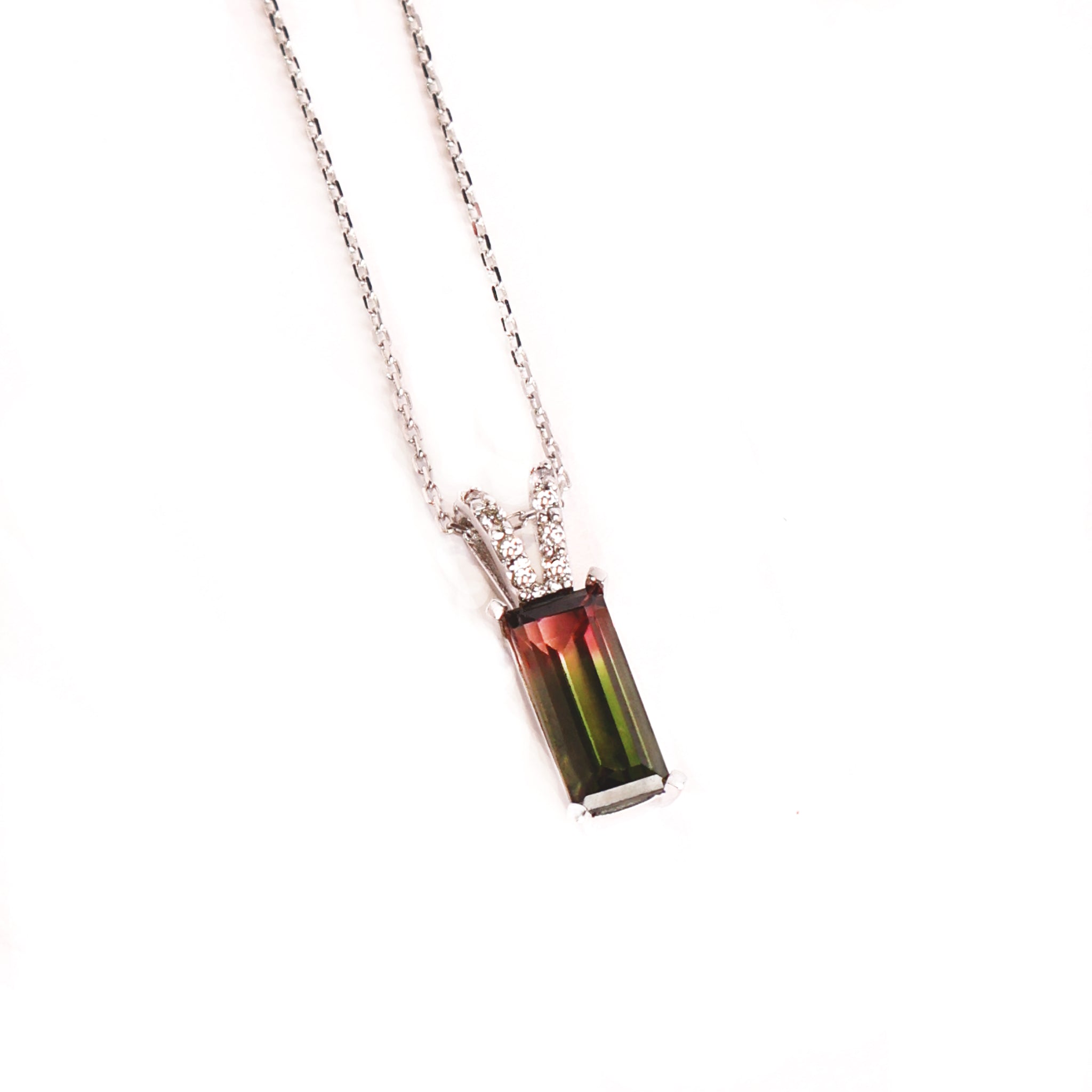 This elegant piece features a 1.30-carat baguette-cut watermelon tourmaline, coloured like the sky’s last sigh—a deep, moody green with a whisper of pink at the crown, fading like the final light of a summer sunset.