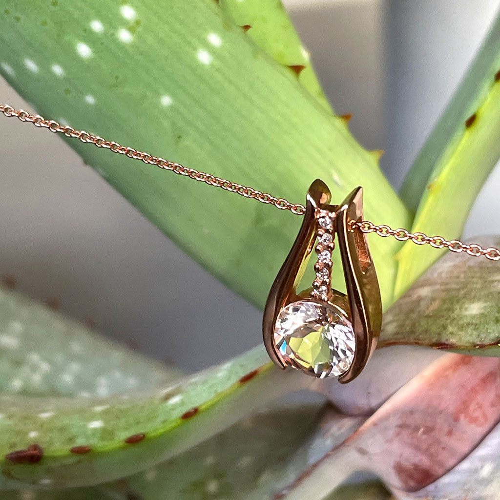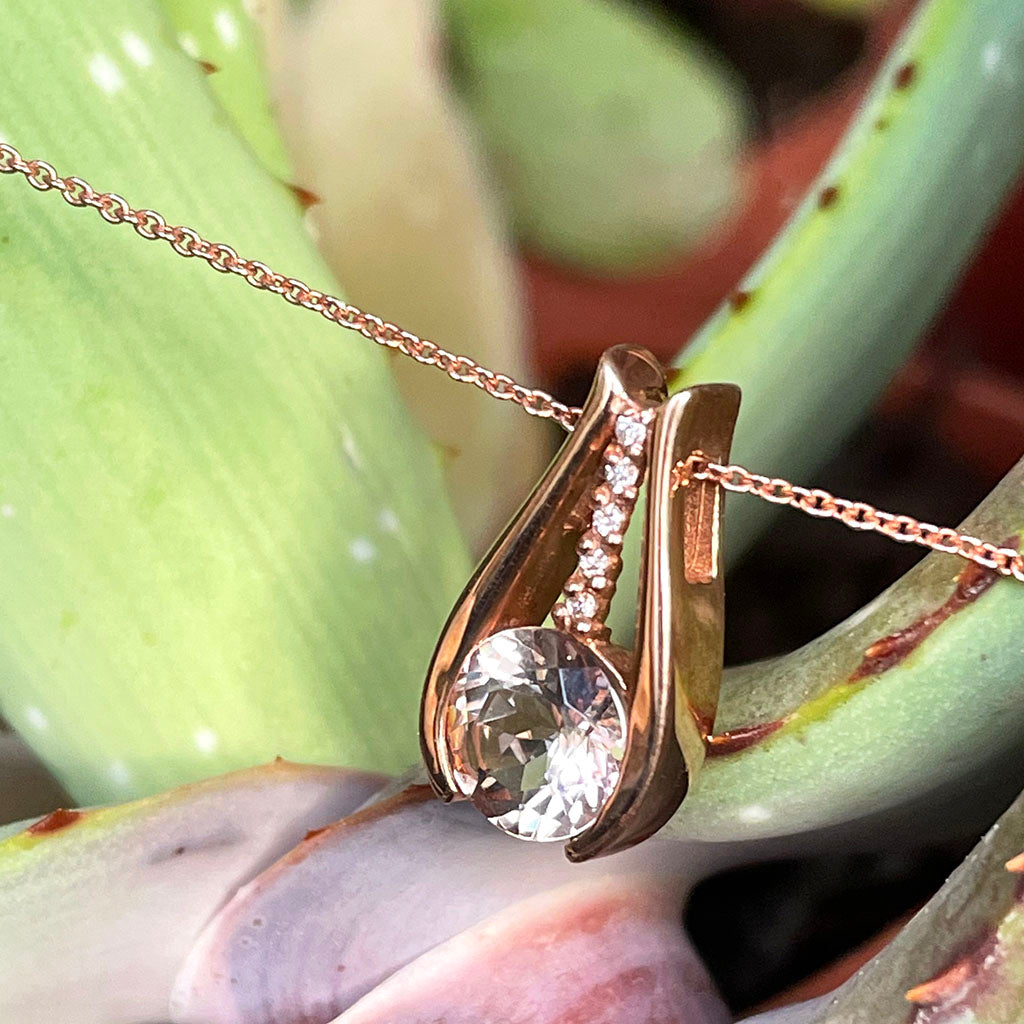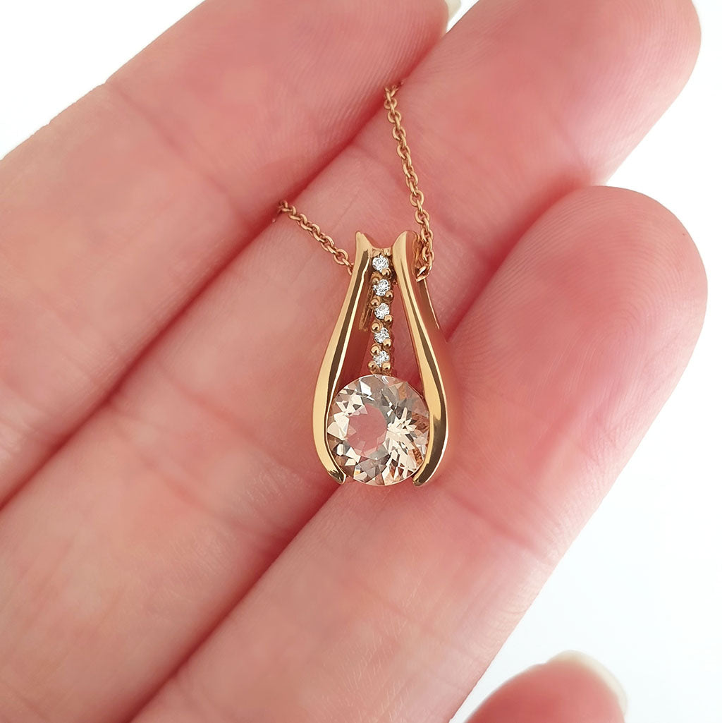 Split Rose Gold Round Cut Morganite Pendant with Diamond Strip Highlight
