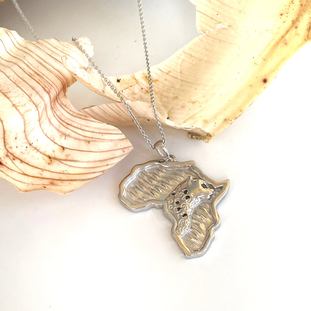 Stand Out Cheetah and Black Diamond Solid Africa Map White Gold Pendant