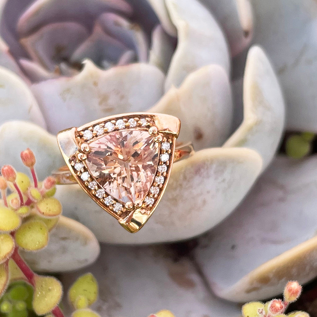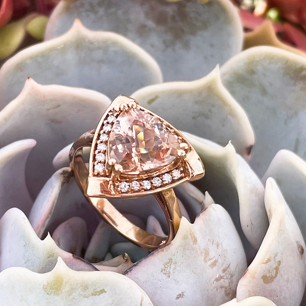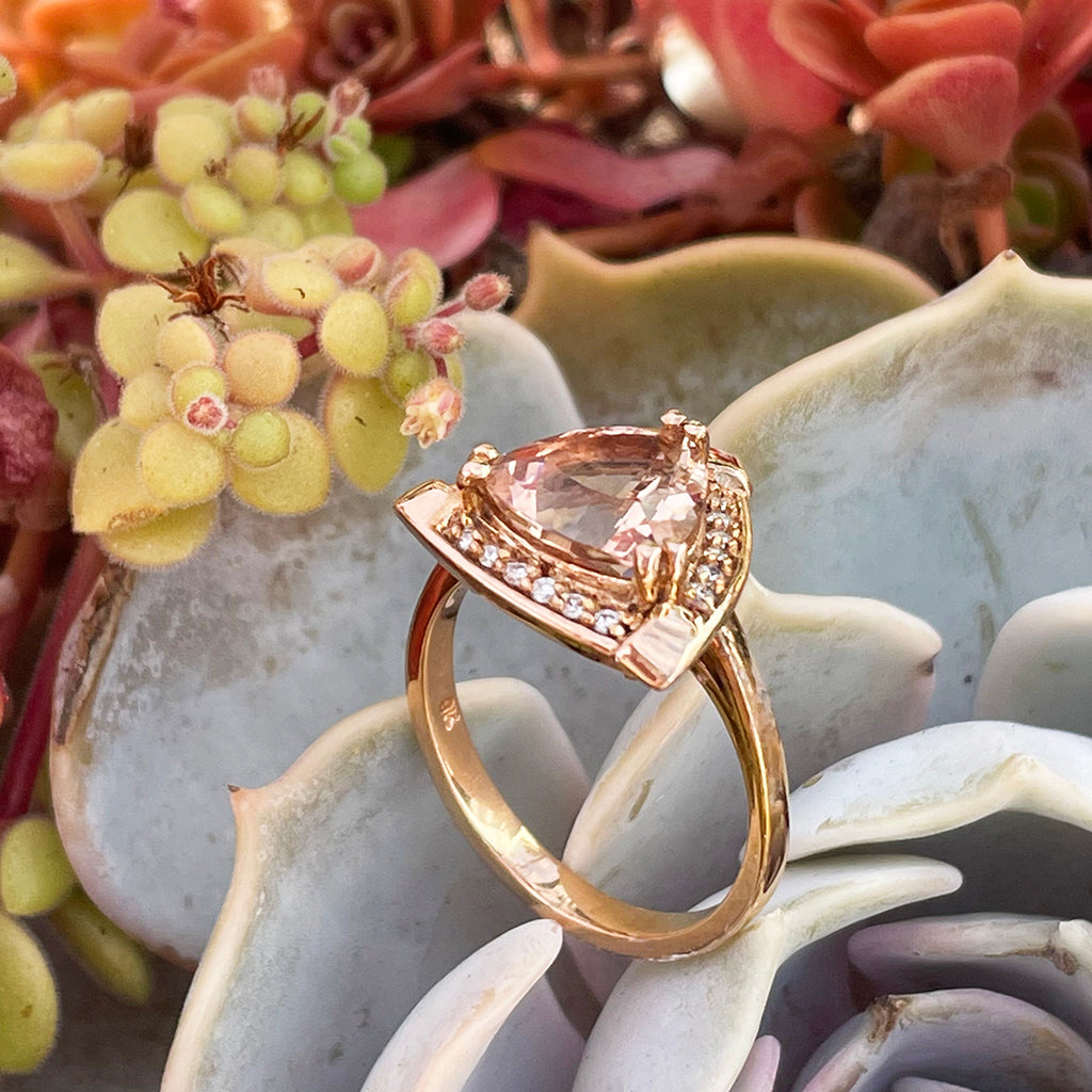 Standout Trilliant Rose Gold Peach Morganite and Diamond Highlight Ring