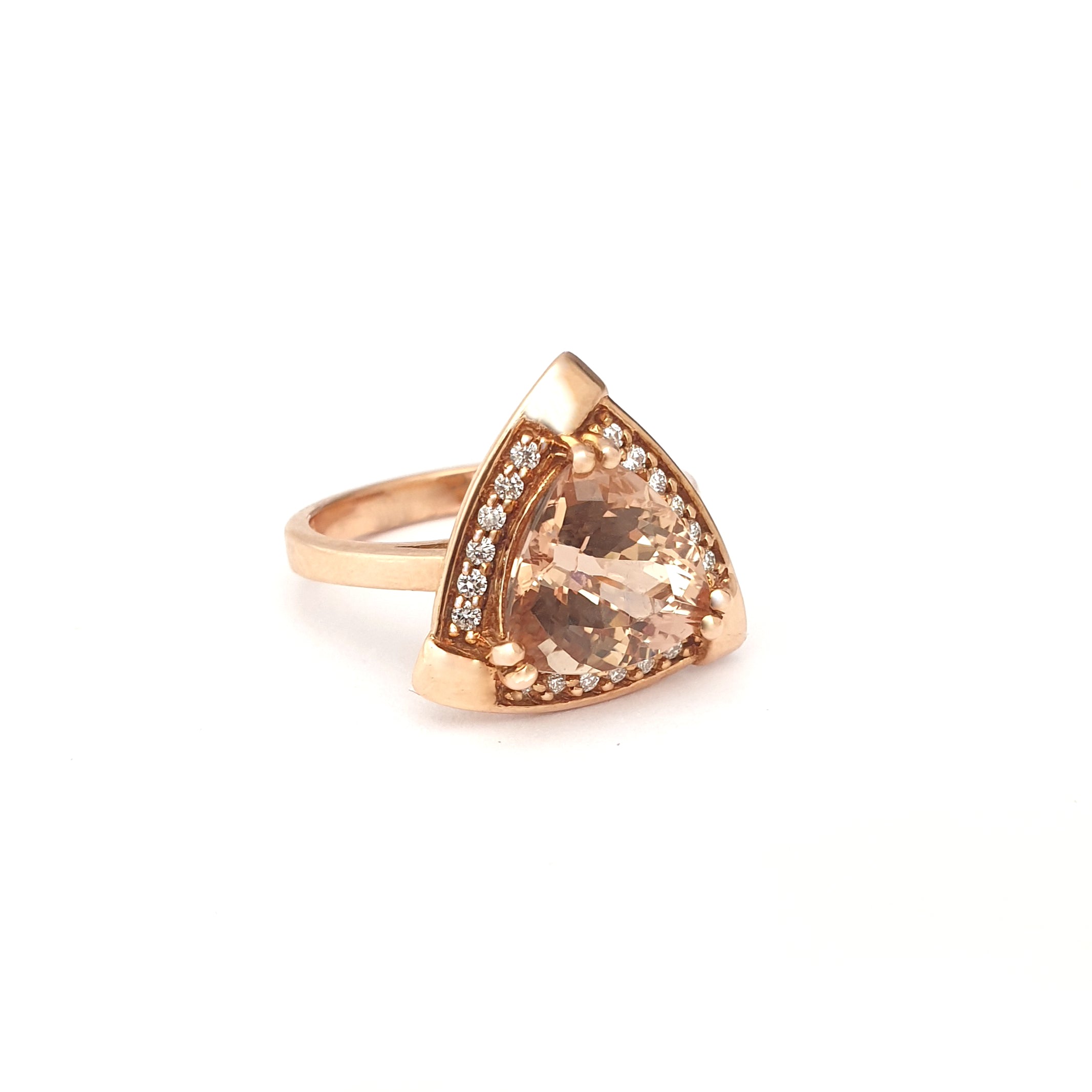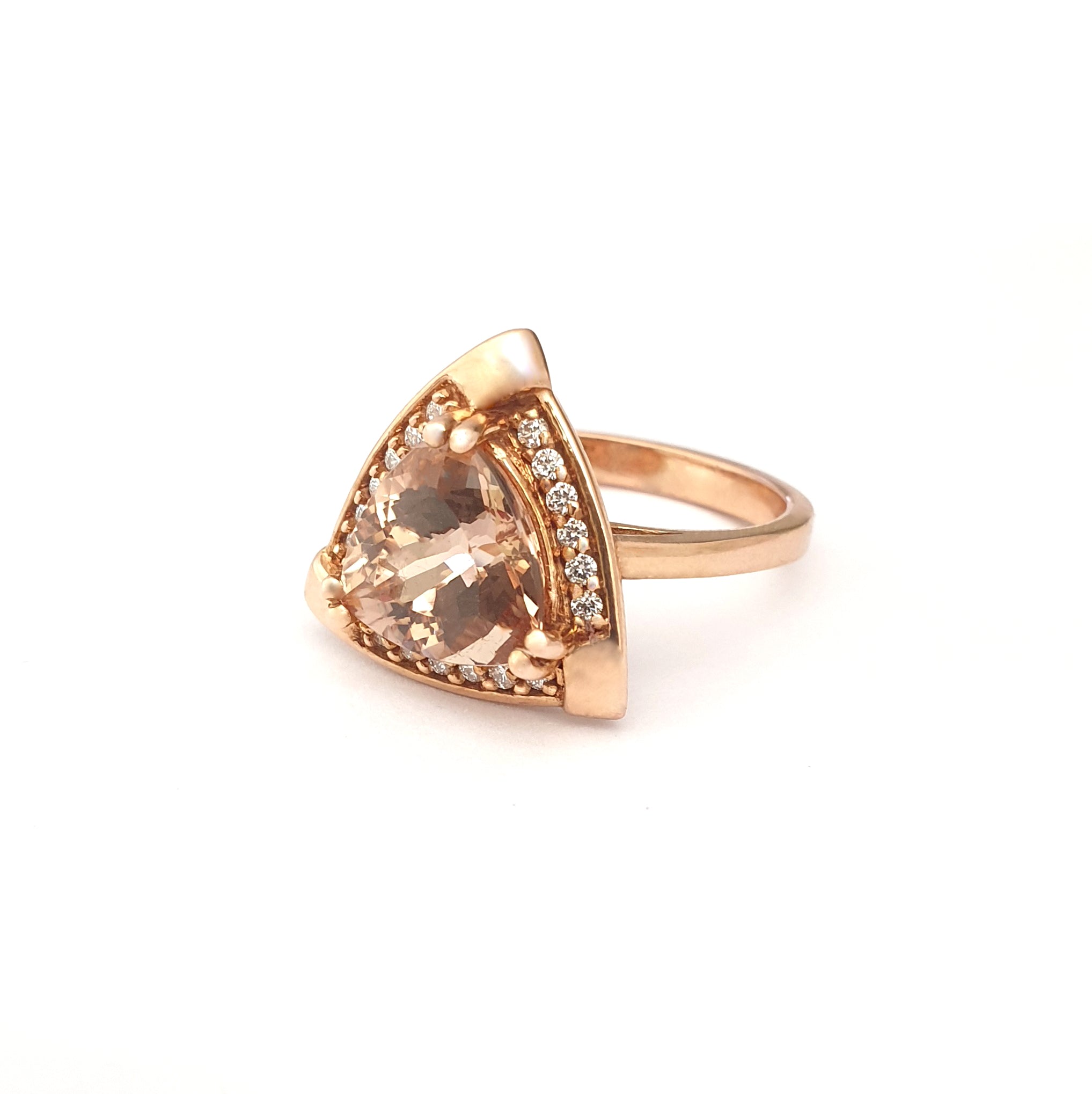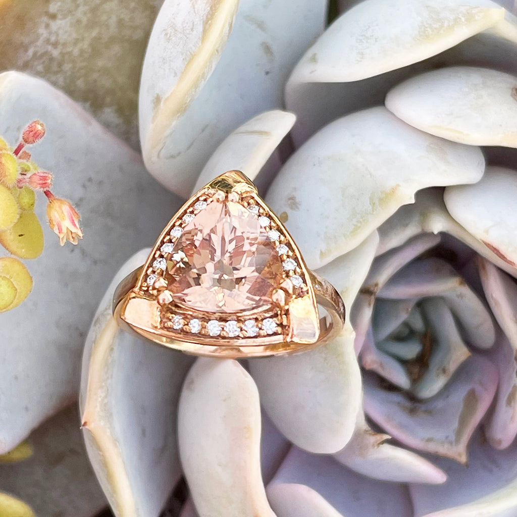 Standout Trilliant Rose Gold Peach Morganite and Diamond Highlight Ring