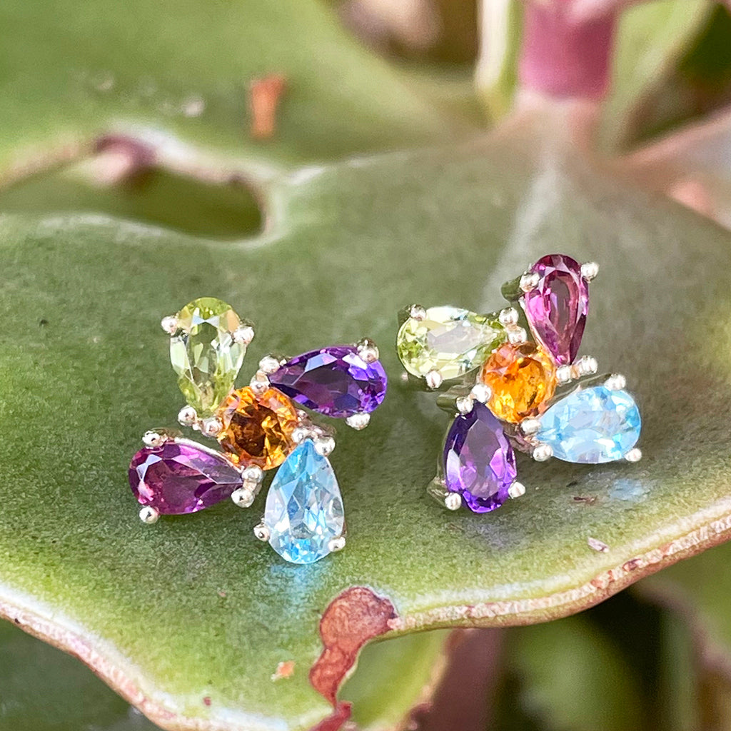 The winsome colours of the gemstones make these Starburst earrings a delicious visual treat. Warm citrine sits at the centre of each earring surrounded by four faceted pear gemstones: topaz, amethyst, peridot and rhodolite garnet. This is a gorgeous pair that radiates with colour, light and joyful delight.