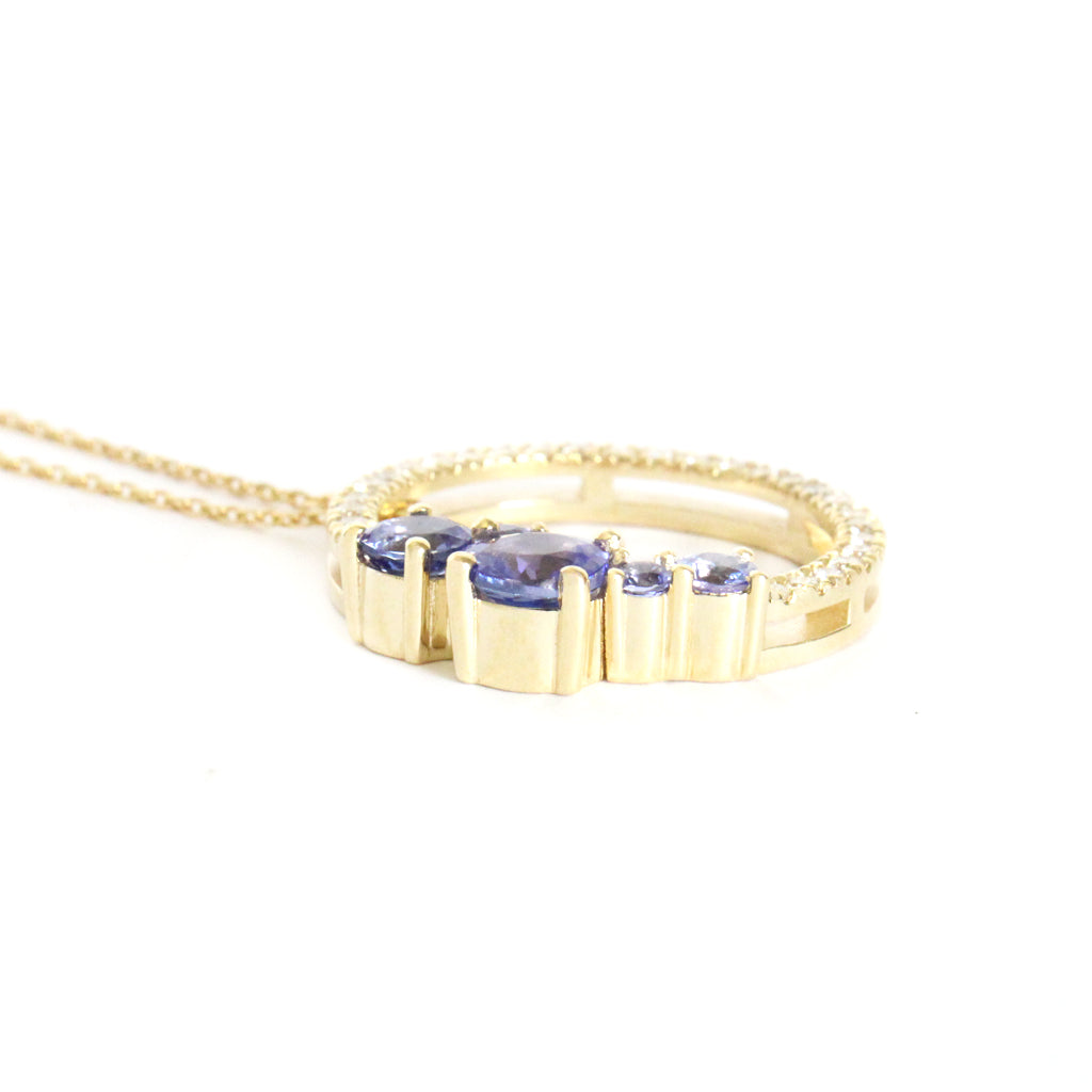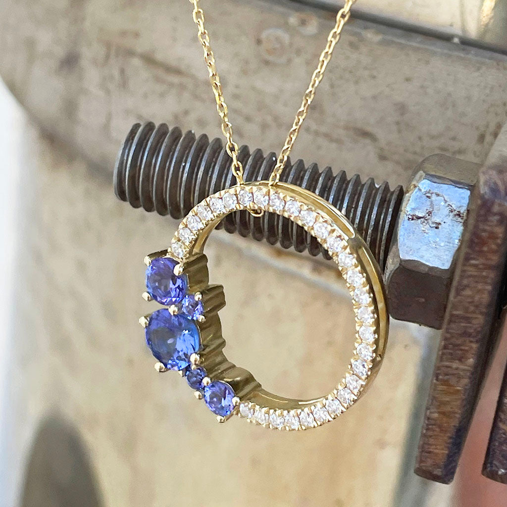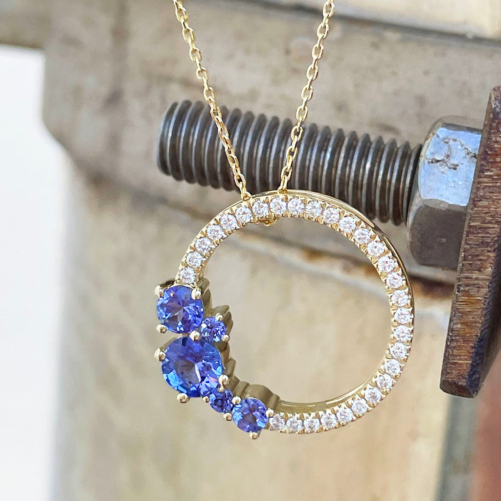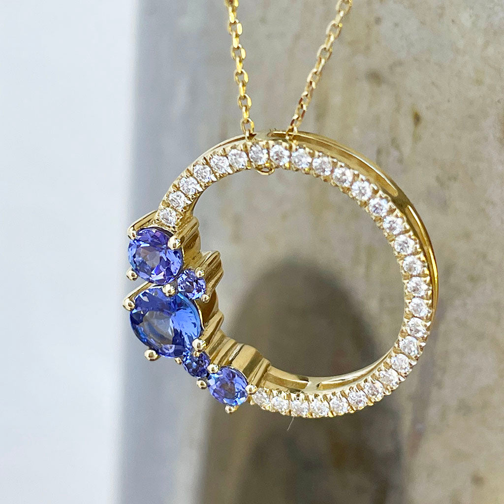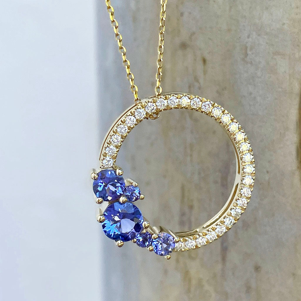 Stunning Tanzanite Cluster Diamond Halo Yellow Gold Pendant
