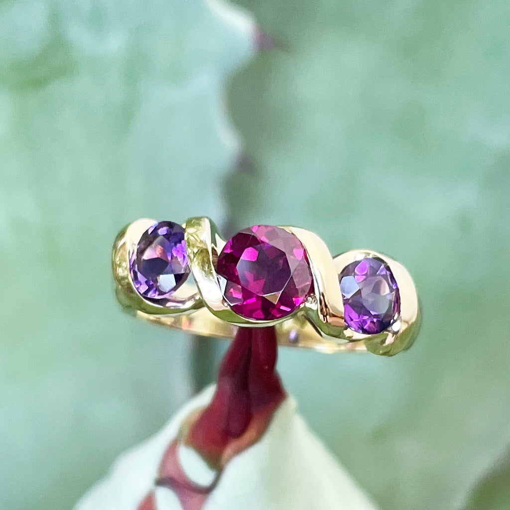 Stylish Amethyst and Rhodolite Yellow Gold Twist Ring