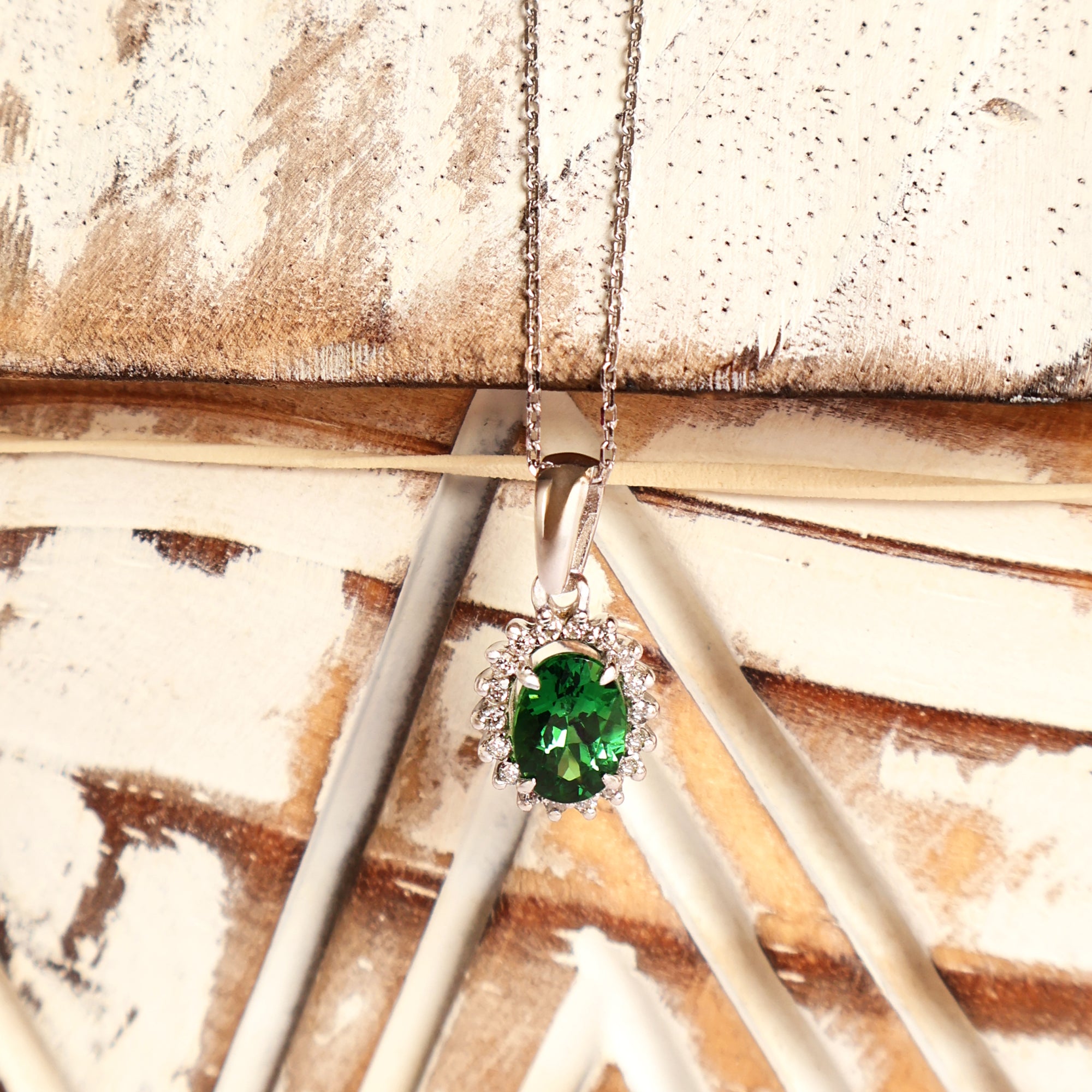 Tsavorite has an enchanting, vivid green brilliance. Its fiery sparkle reflects light with a lively, natural glow. Paired with diamonds, this gemstone transforms your jewellery into a vision of fresh, radiant beauty. This exquisite pendant is designed to capture and radiate light. An oval faceted Tsavorite rests at its heart, encircled by a halo of shimmering diamonds and set in gleaming white gold.