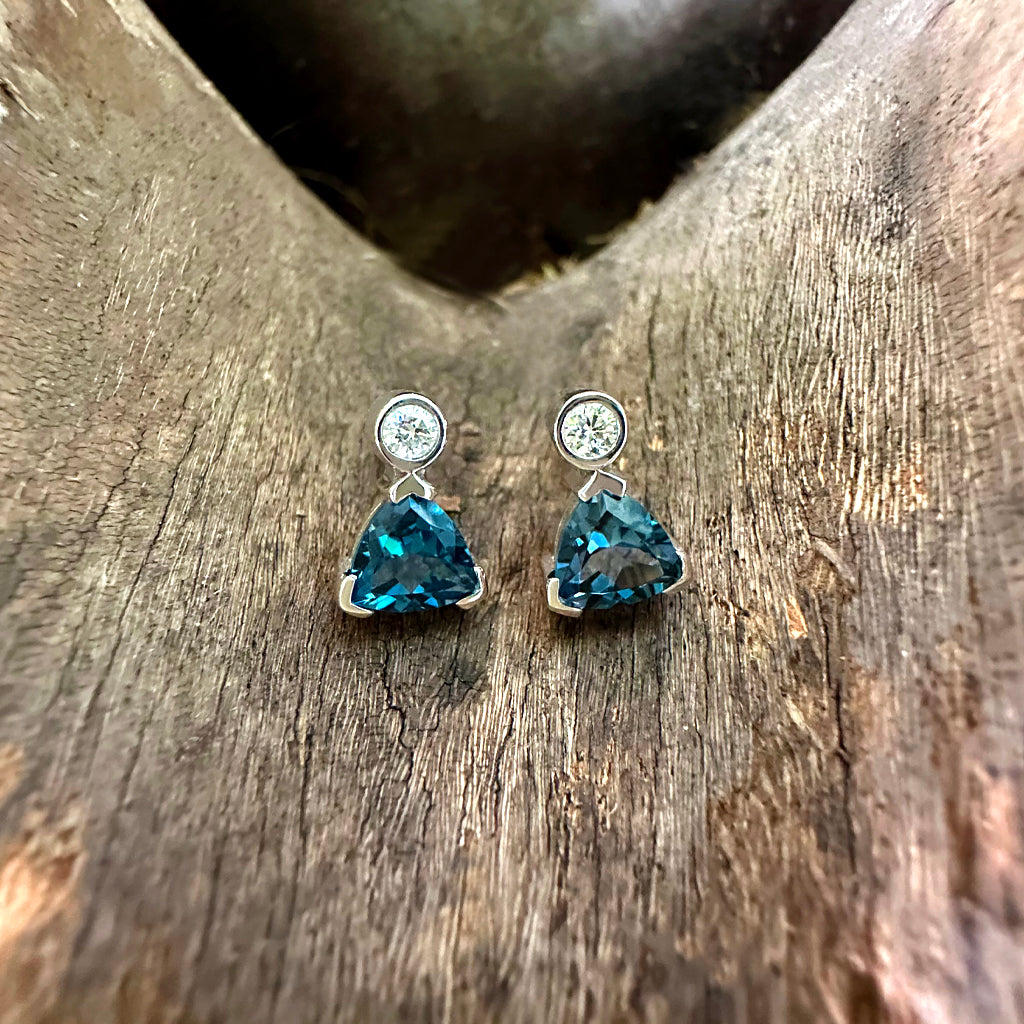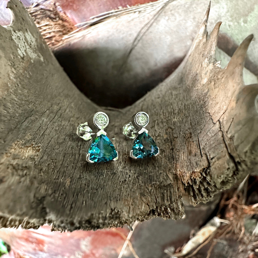 A perfect fusion of classic allure and contemporary sophistication, these sublime studs are versatile and enduring, suited for every occasion. Each striking London Blue topaz, faceted into a captivating trilliant cut, is crowned with a brilliant, bezel-set diamond at its apex, adding a touch of shimmering grace to their deep azure hue. White gold brings the classic touch, making these earrings the embodiment of ferocious beauty and timeless design.