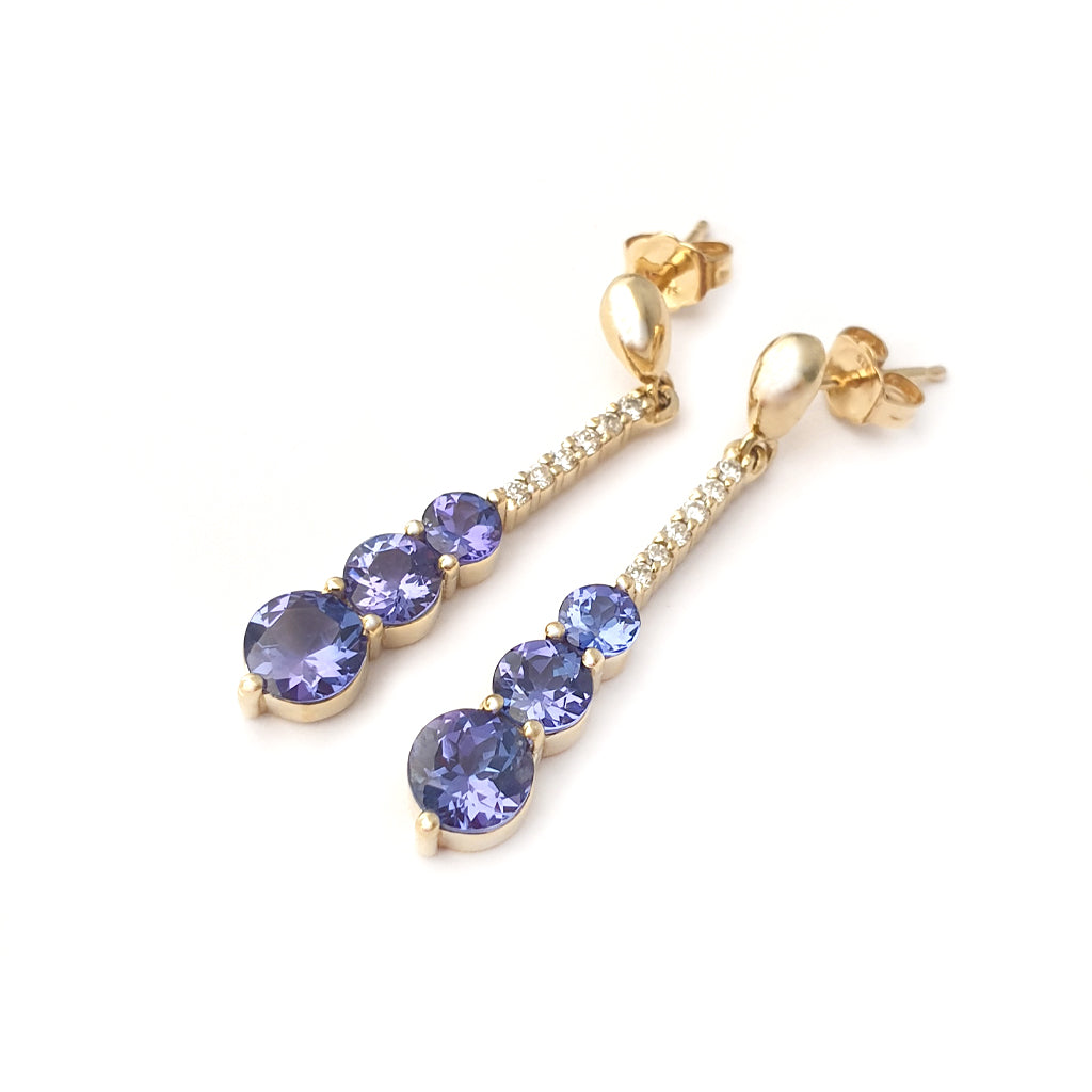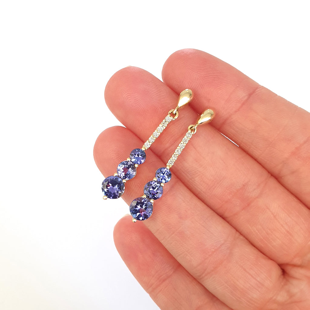 Tanzanite and Six Diamond Drop Yellow Gold Earrings
