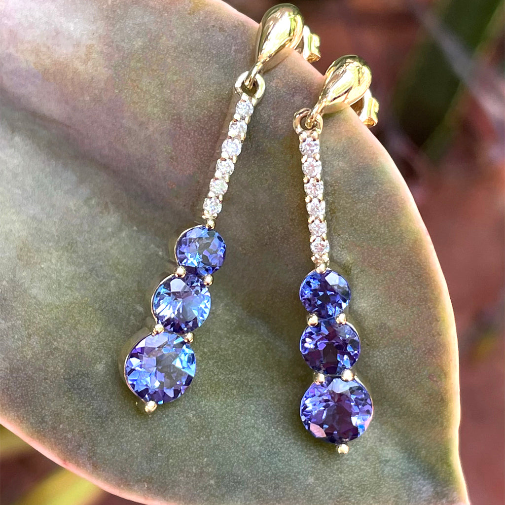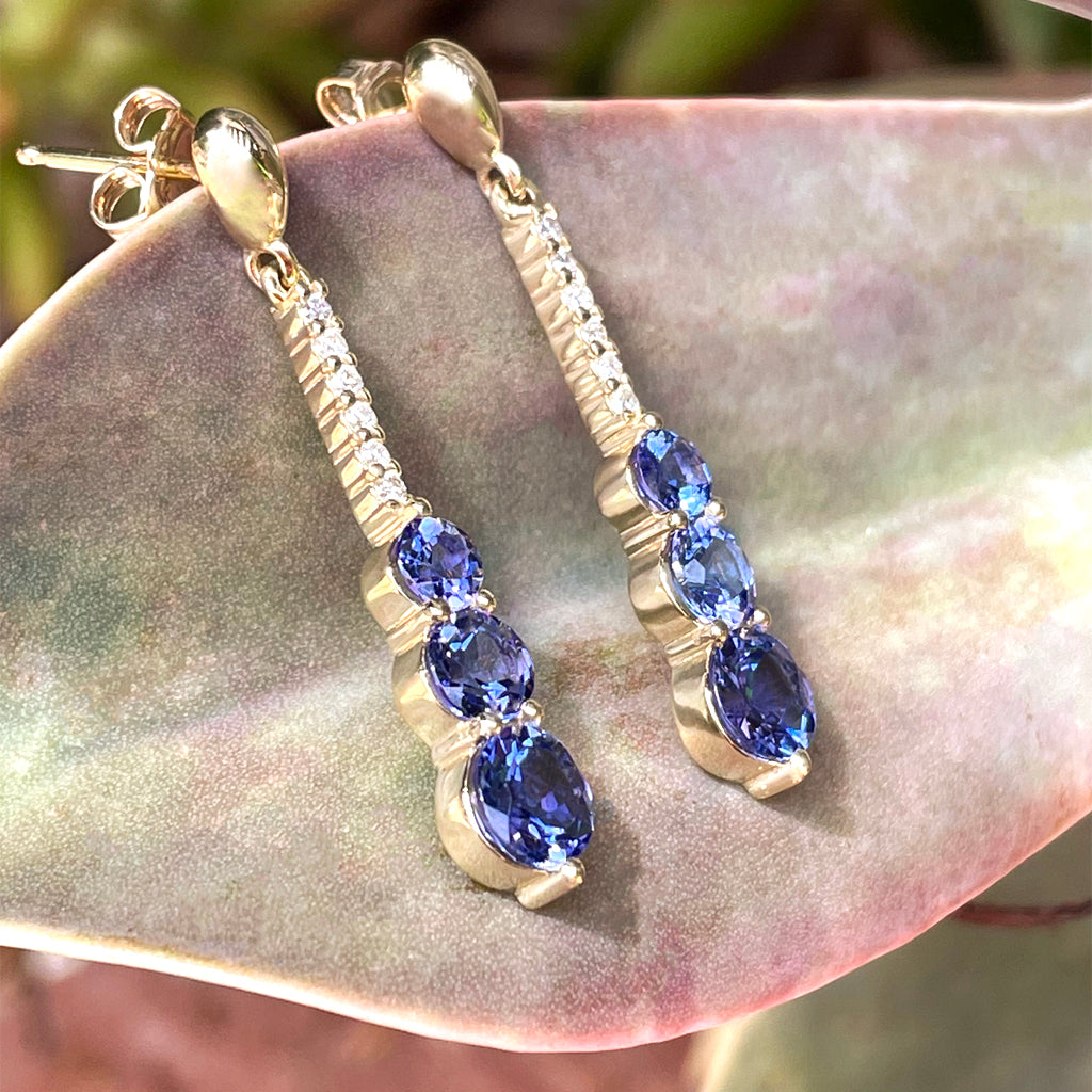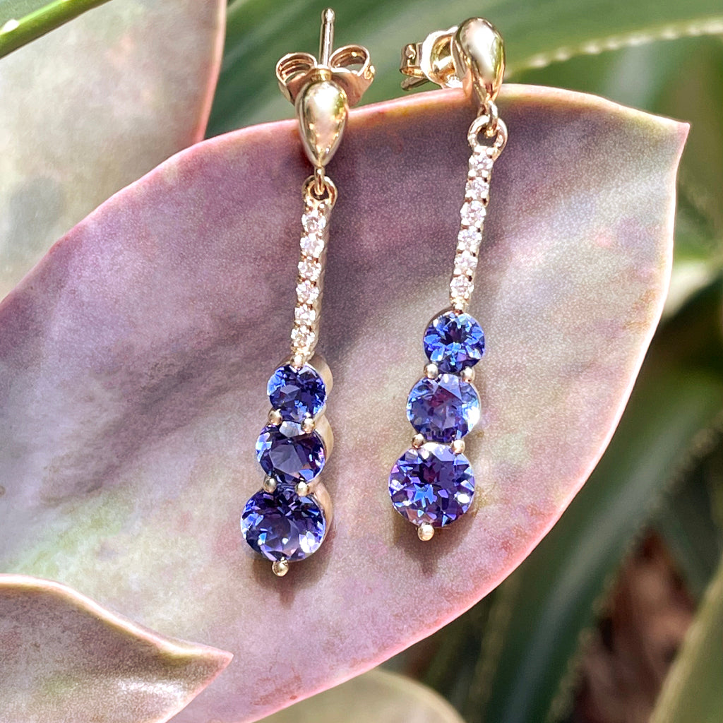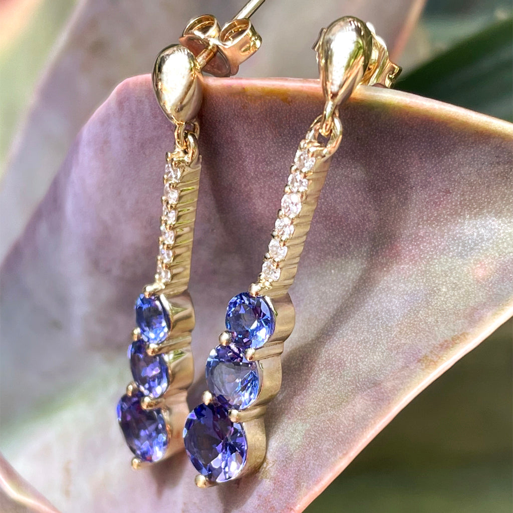 A trilogy of bold, faceted round tanzanites and a ladder of six sparkling white diamonds create a sense of fantastical luxuriousness in these superb yellow gold earrings. There's something to be said for letting your look do the talking, and these gorgeous earrings say so much: you love extravagance, yet wear it with grace; you're timelessly stylish, yet you don't follow fashion trends. They'll turn your date night outfit into a Oscar night red carpet triumph, even when your look is effortlessly casual in jeans and a tucked T.