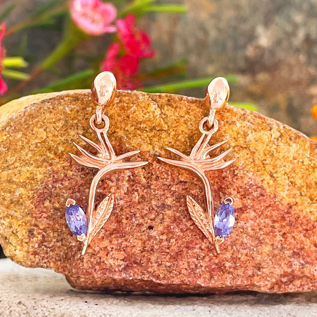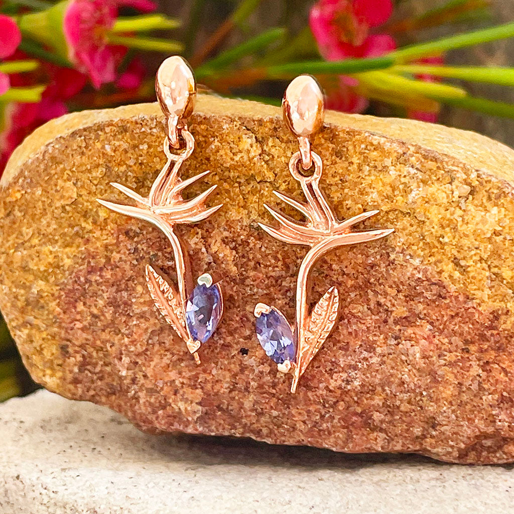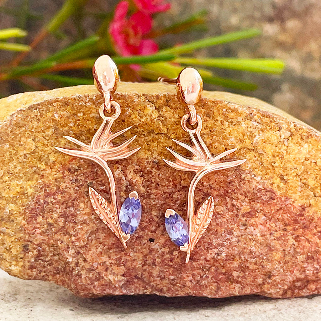 Tanzanite Bird of Paradise Rose Gold Drop Earrings