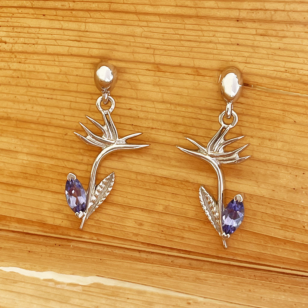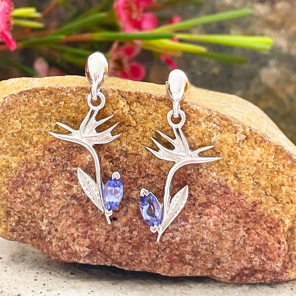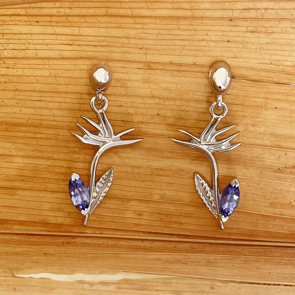 Tanzanite Bird of Paradise White Gold Drop Earrings