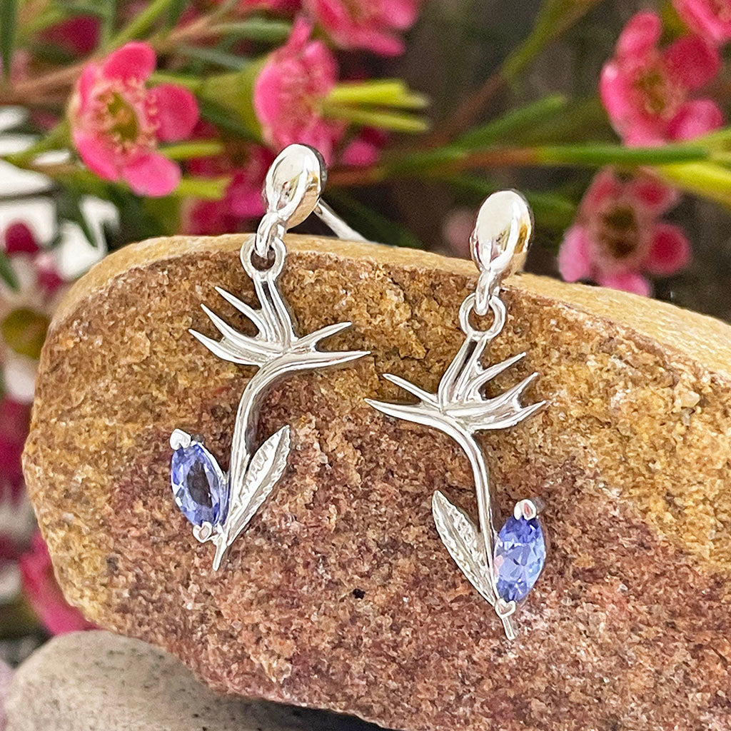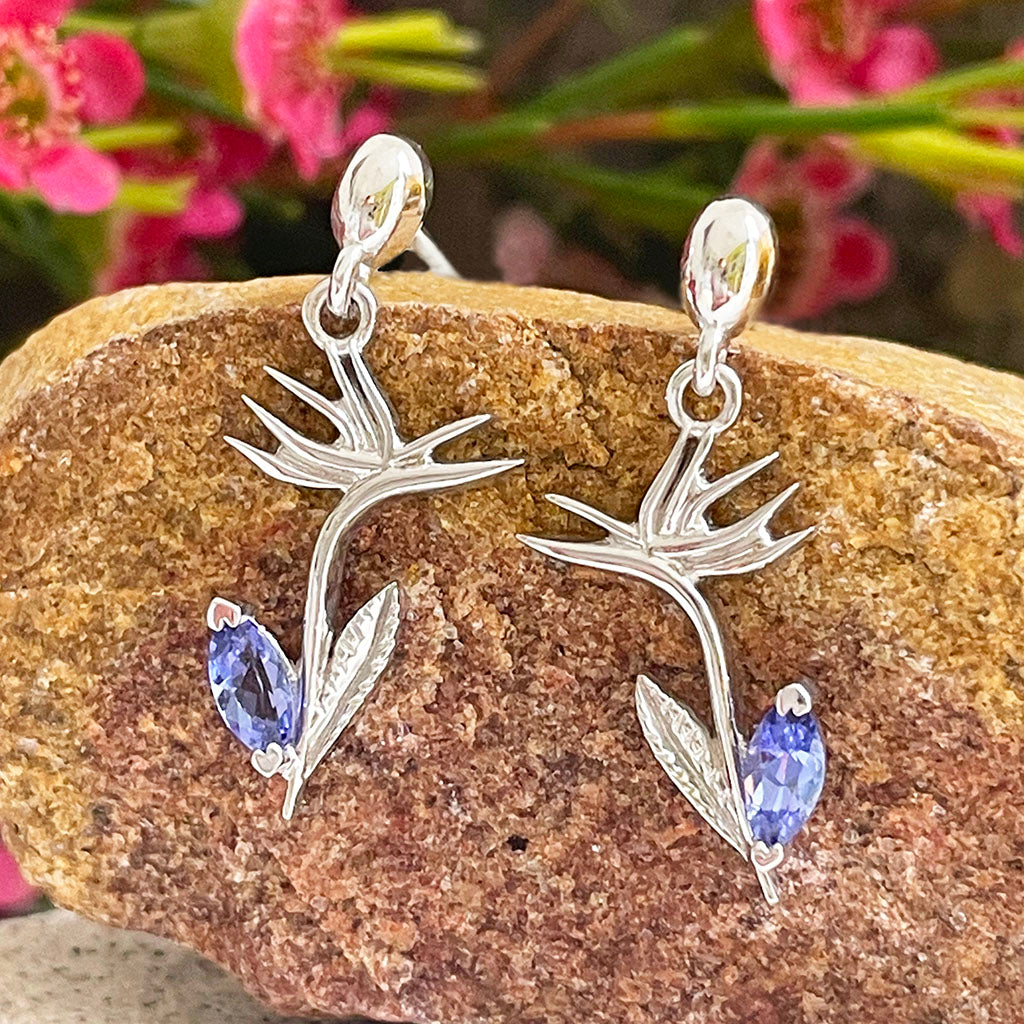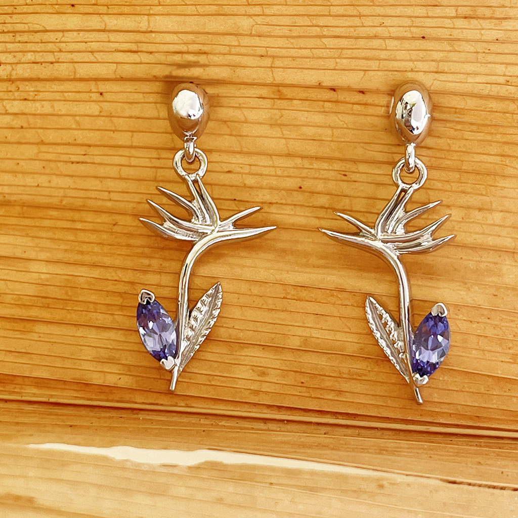 Tanzanite Bird of Paradise White Gold Drop Earrings
