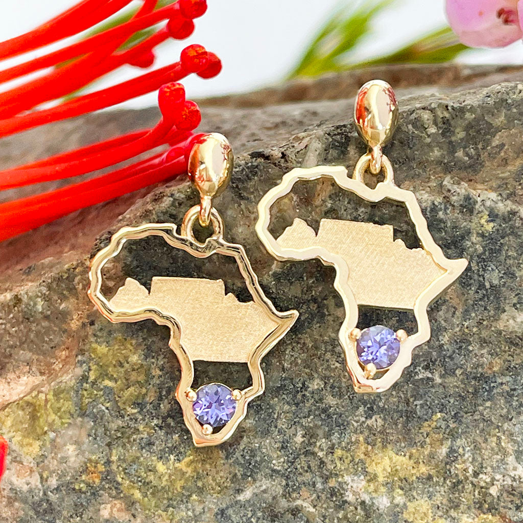 Tanzanite Table Mountain and Africa Map Earrings in Yellow Gold