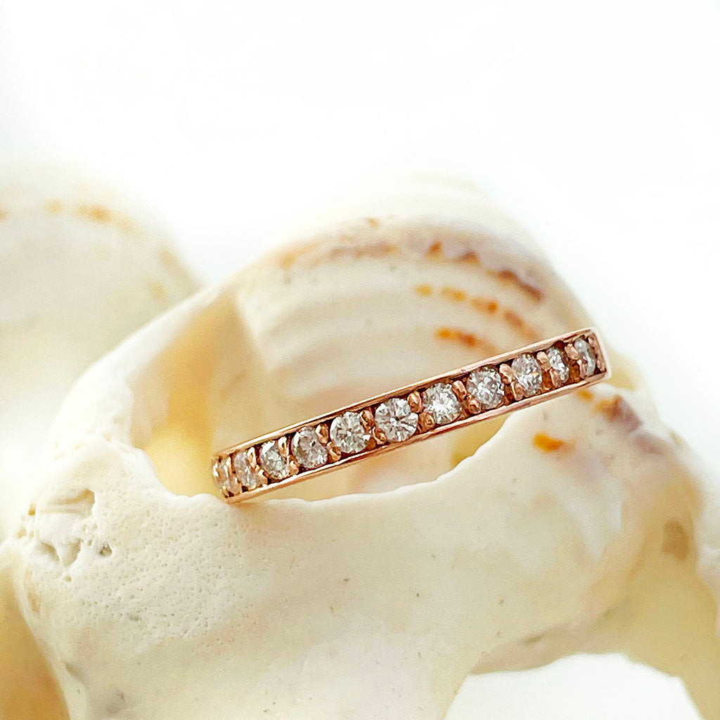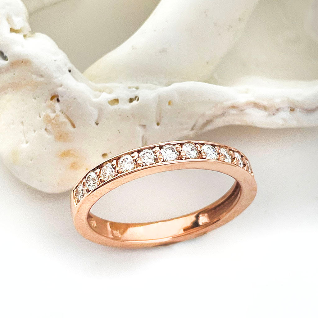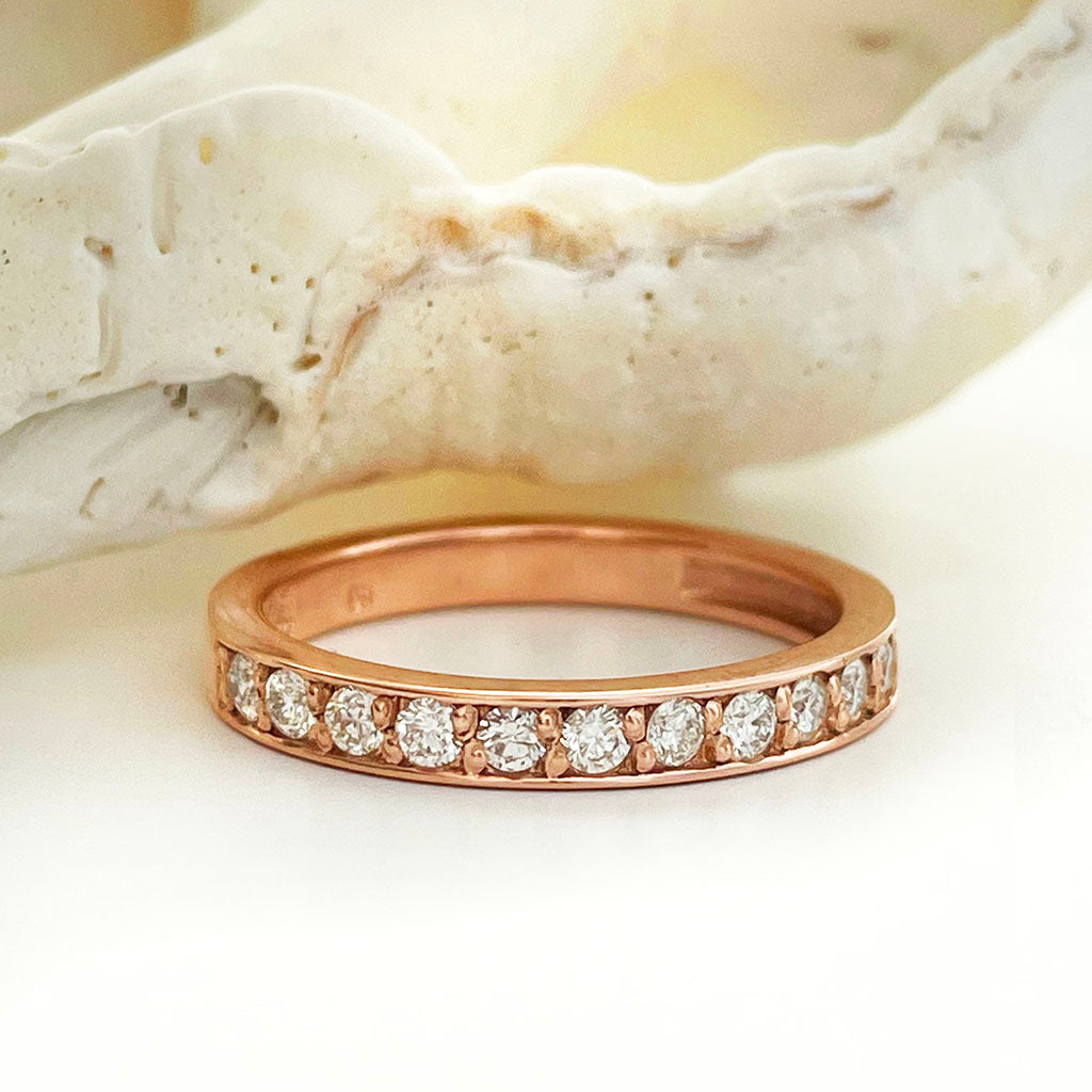 Classic with a twist of modern warmth. Thirteen round-cut white diamonds sit flush in a rose gold claw setting, forming a radiant half eternity band that’s both timeless and undeniably current.
