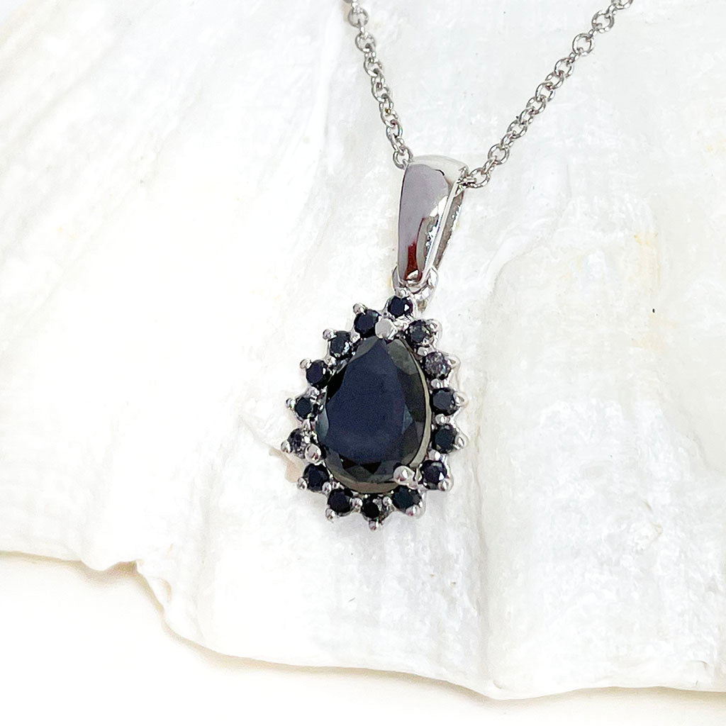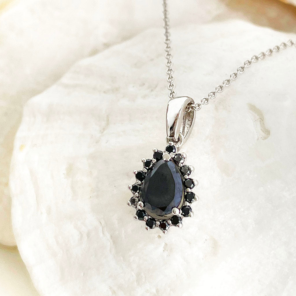 The Perfect Pear Cut Black Diamond and Halo White Gold Pendant