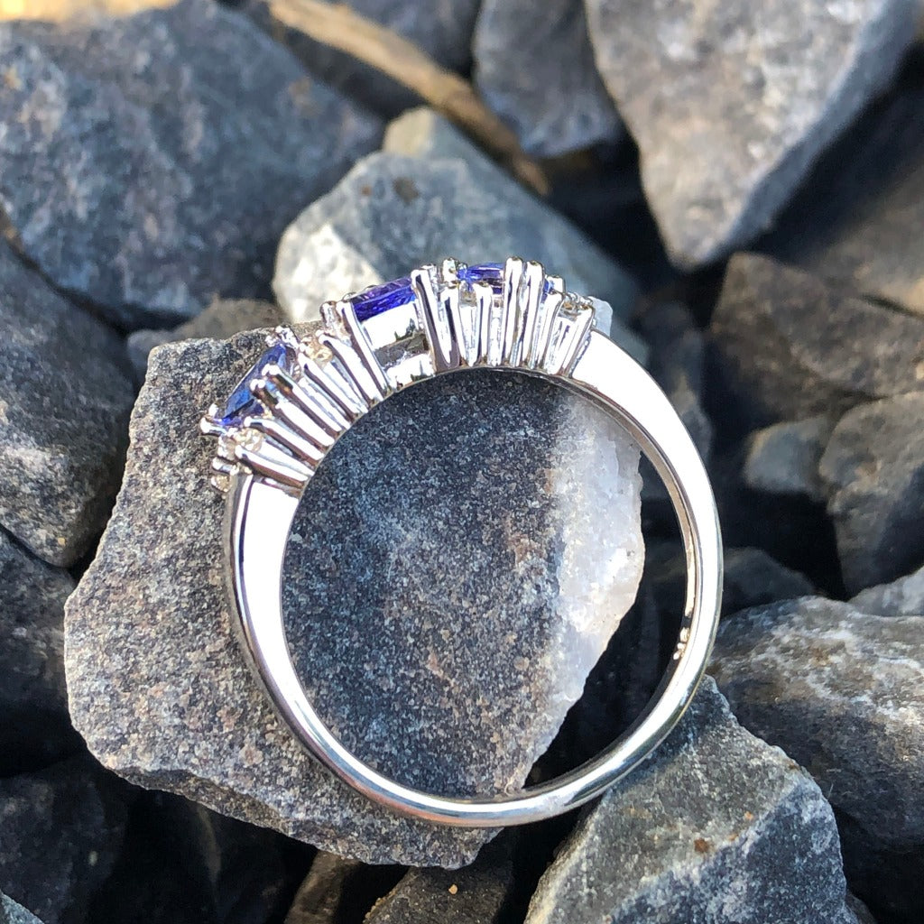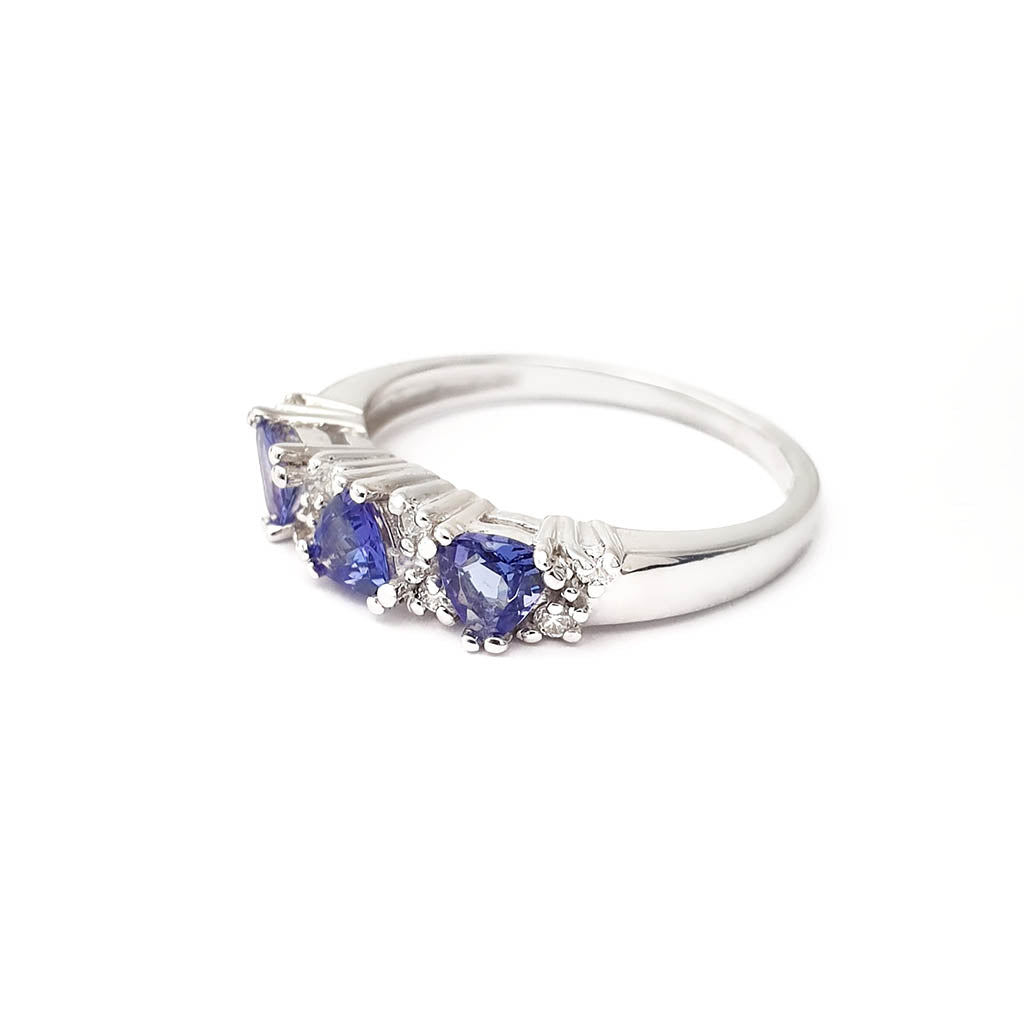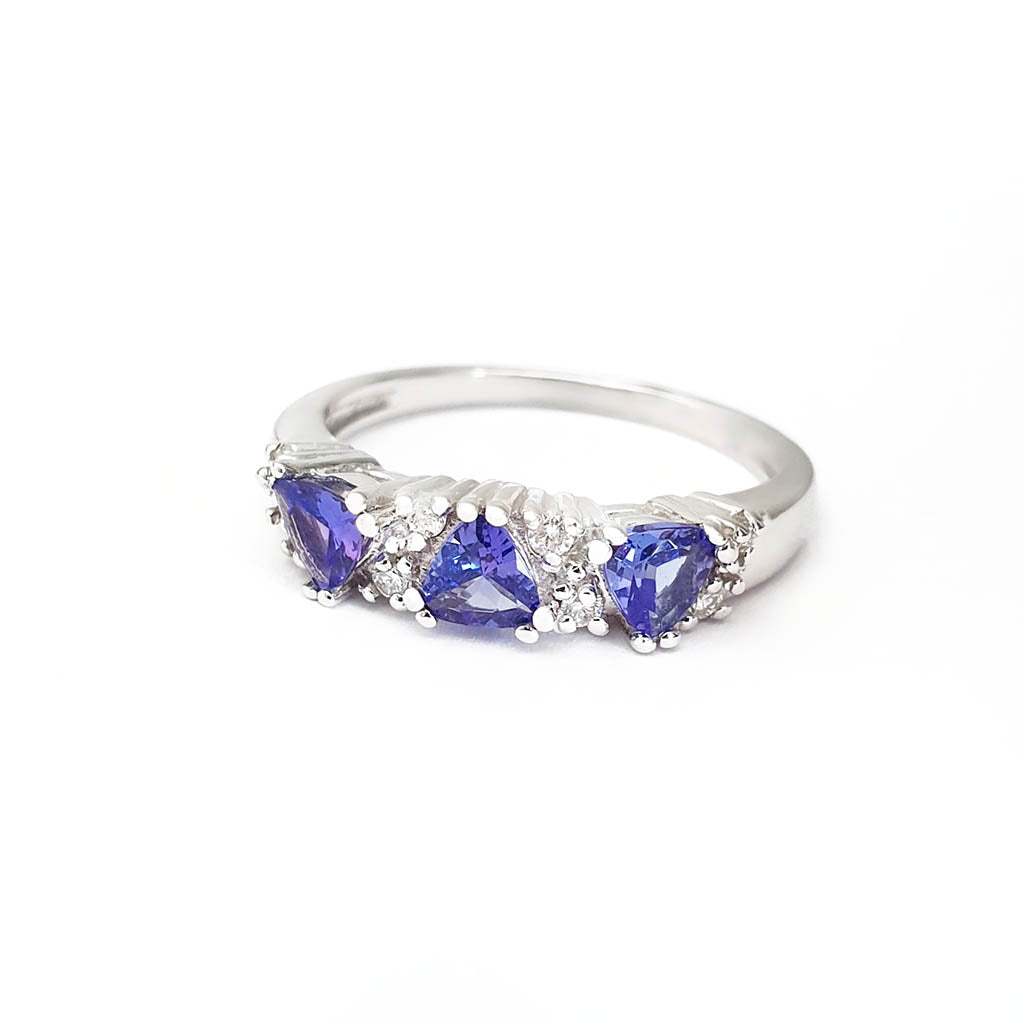 Three Trilliant Cut Tanzanite with diamond accent ring