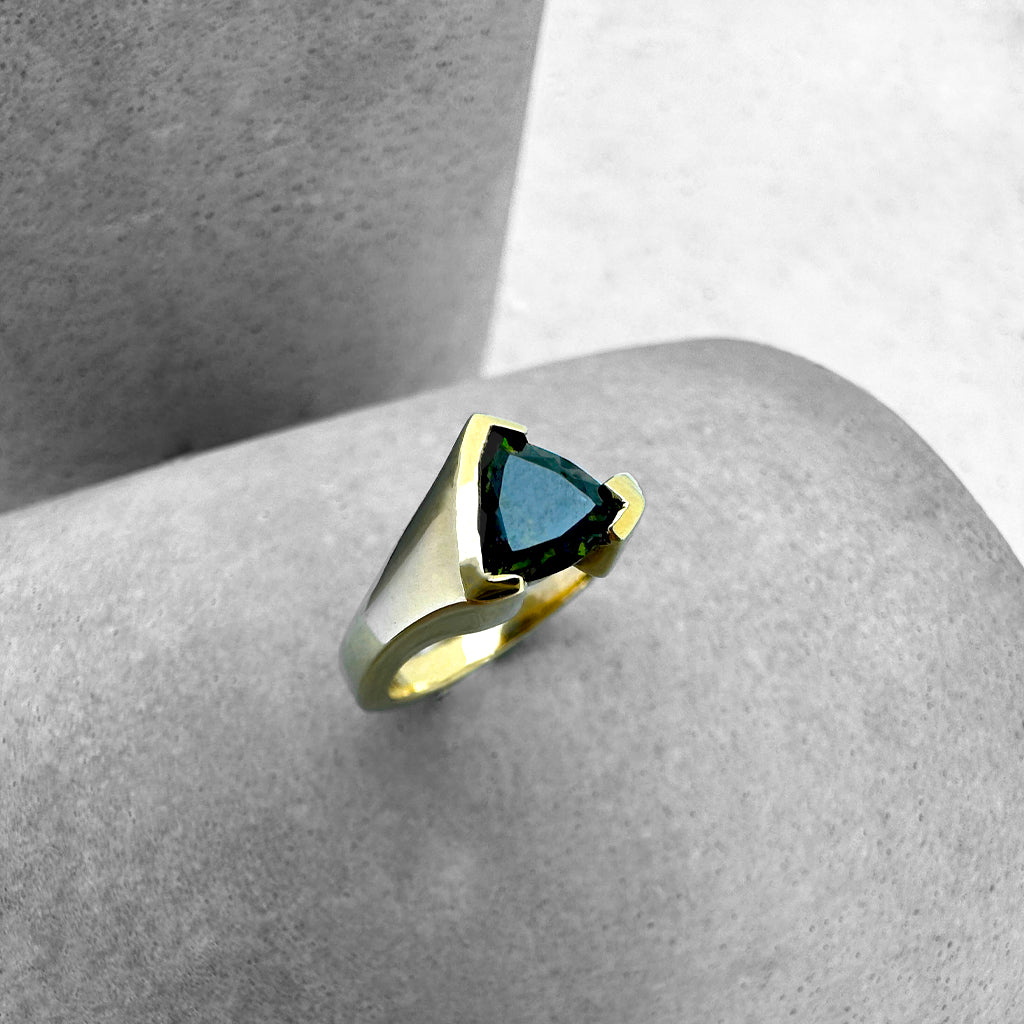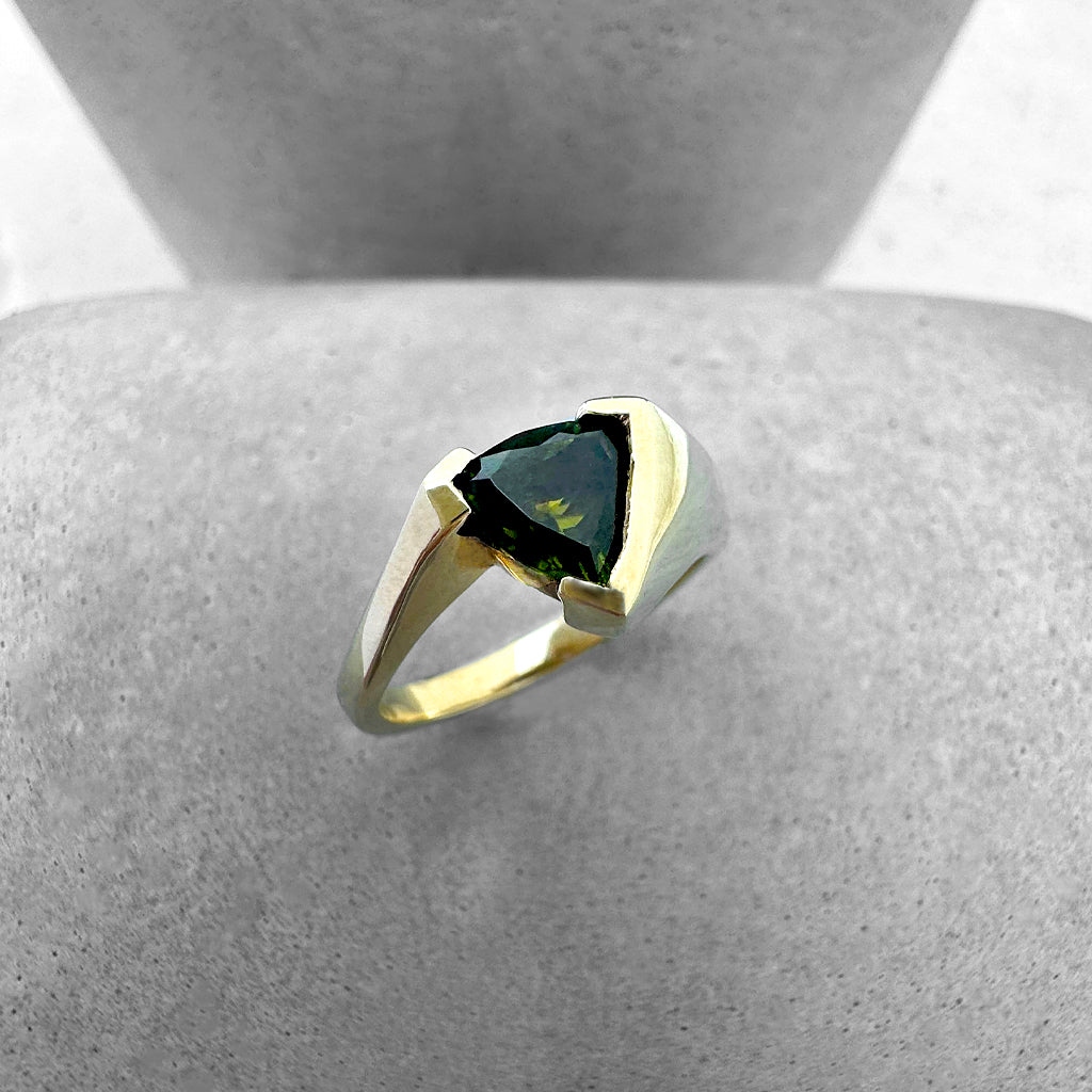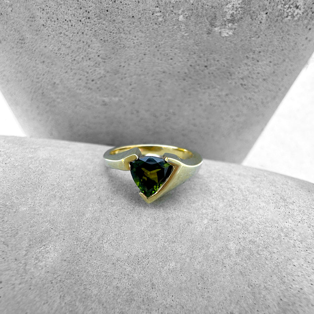Trilliant Cut Green Tourmaline with Twisted Yellow Gold Band