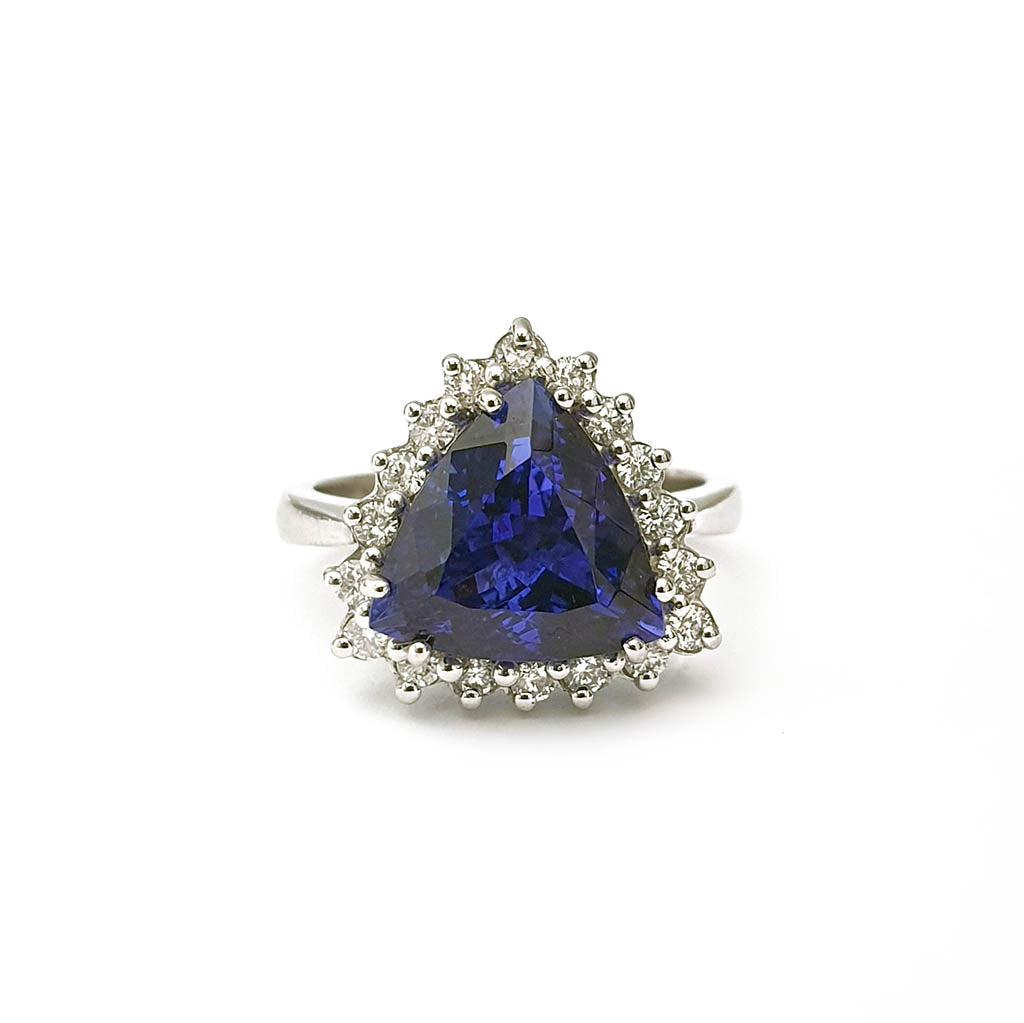 Trilliant Cut Tanzanite and Diamond Halo Ring