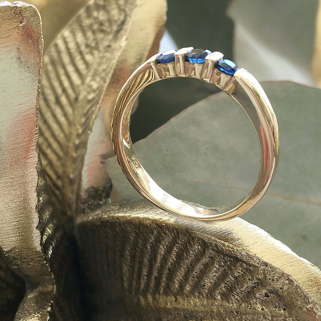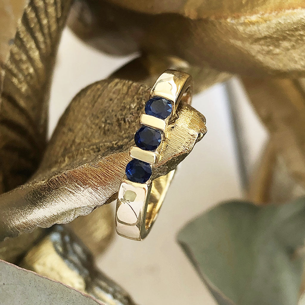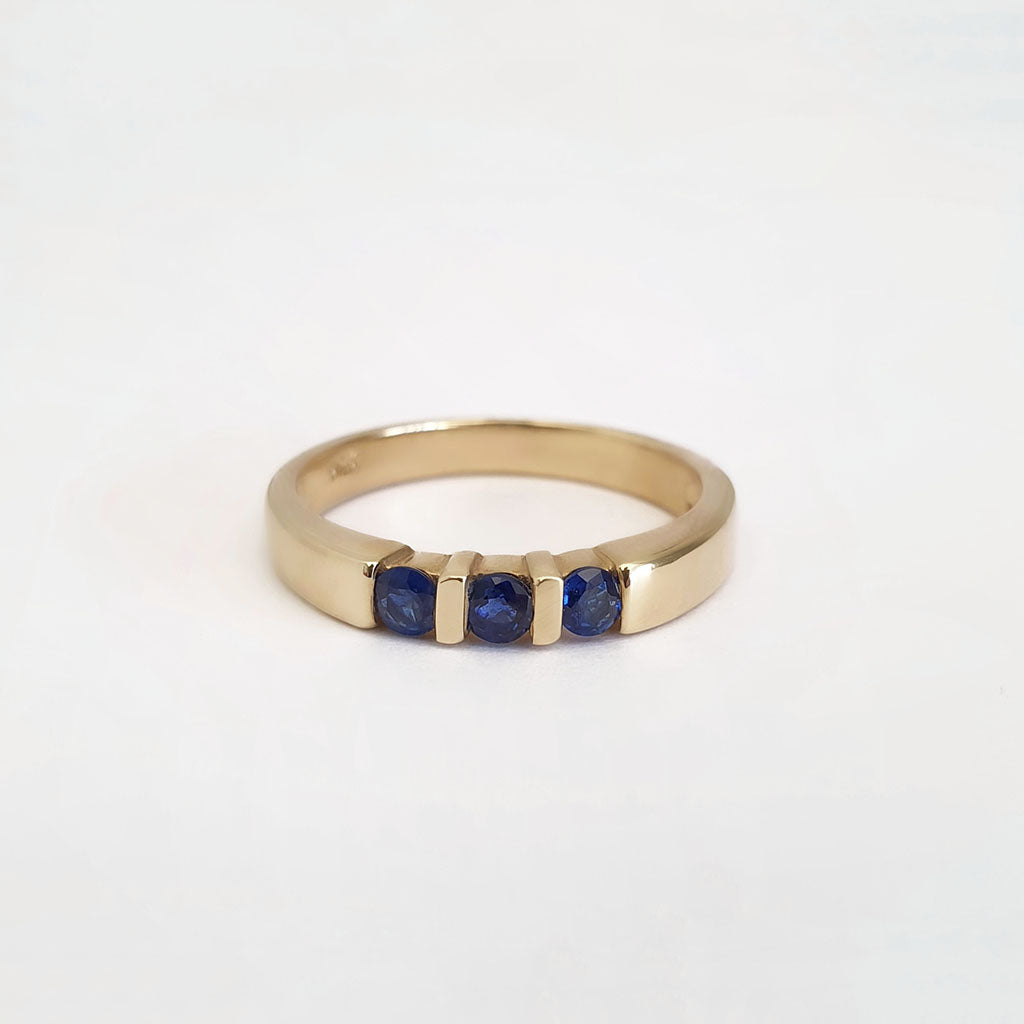 This time, you won't let her go. At the next blue moon, you're going to give her a ring with three round cut sapphires, one for each moonlit meeting, in yellow gold with the same warm tones as her skin.