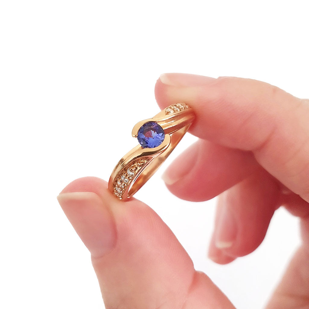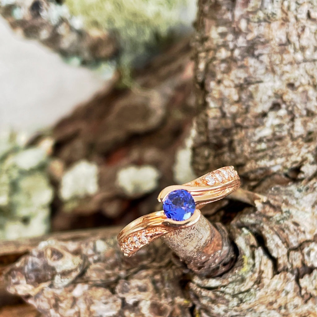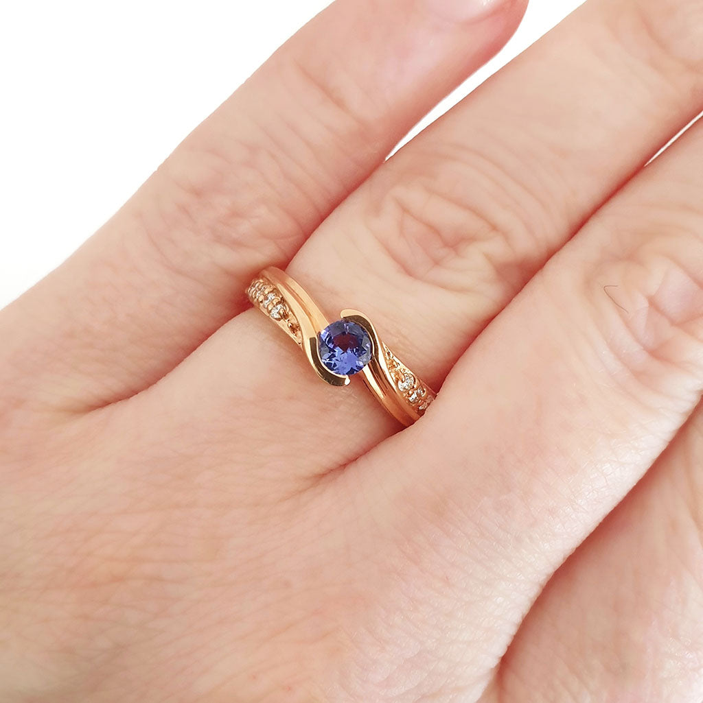 Half Bezel Twist Tanzanite and Playful Diamond Shoulder Rose Gold Ring