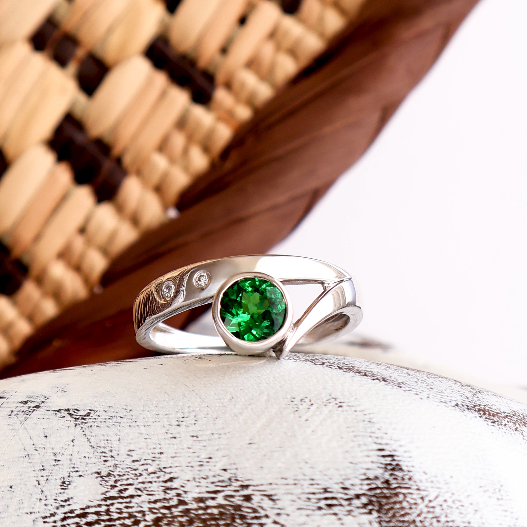 The vivid saturation of the striking Tsavorite is further accentuated by a white gold bezel. Stone and metal complement one another, elevating the gemstone’s vibrant green brilliance. The ring’s shank, pinpointed with two diamonds, curves around the finger from wide to narrow, splitting at the shoulder to enhance the organic feel while maintaining a strong sense of architectural elegance.