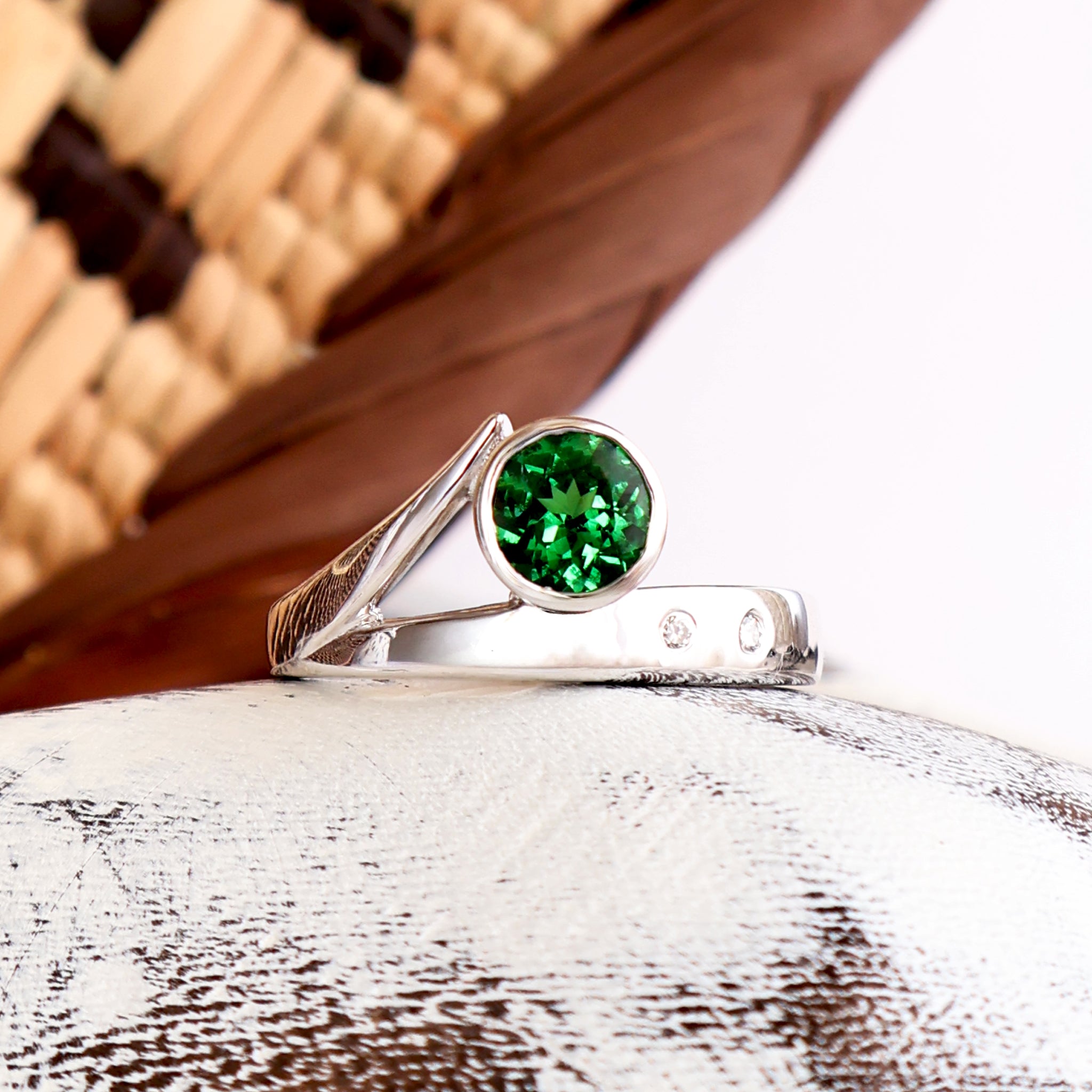 Unique Sculptural Tsavorite and Diamond White Gold Ring