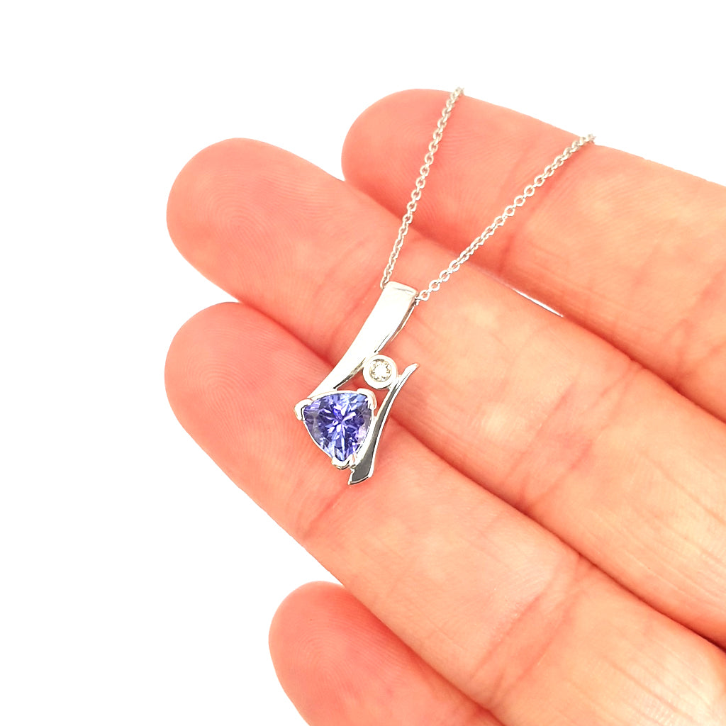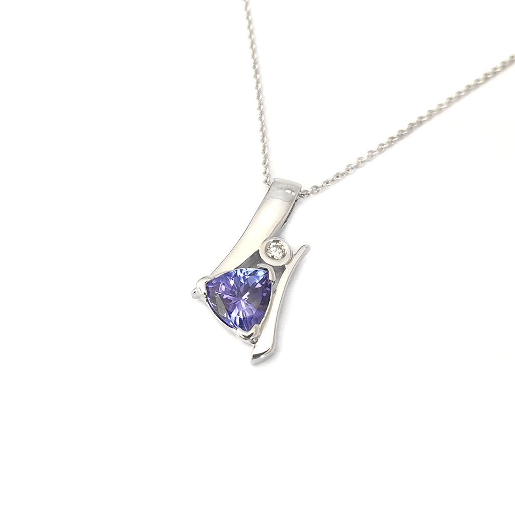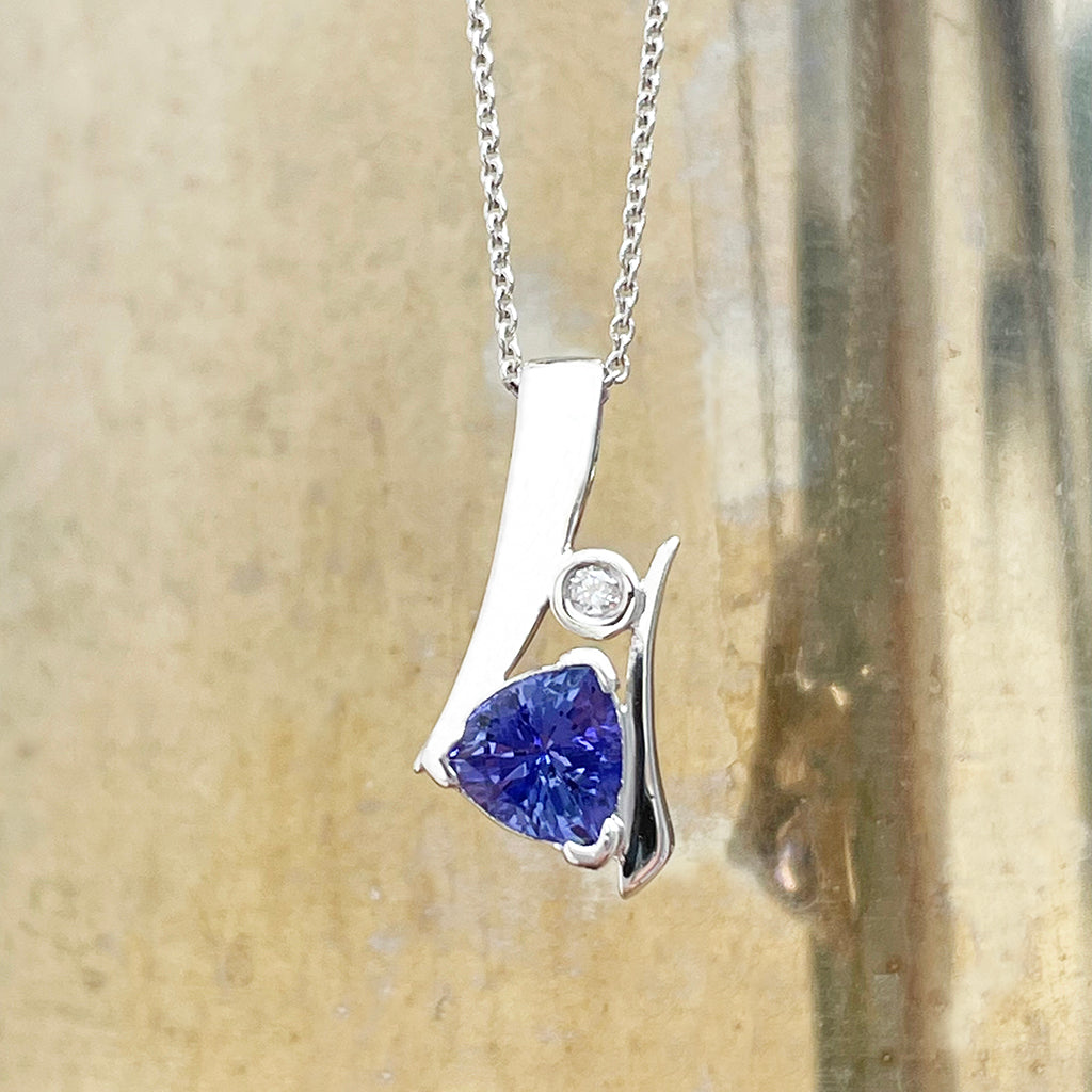 Crafted in nine-carat white gold, this unique pendant features a delicate asymmetrical design and a faceted trilliant tanzanite accented by a sparkling bezel set diamond. The trilliant cut enhances the light and colour refracting qualities of the tanzanite, its blue-violet hues intensified by a half bezel setting.